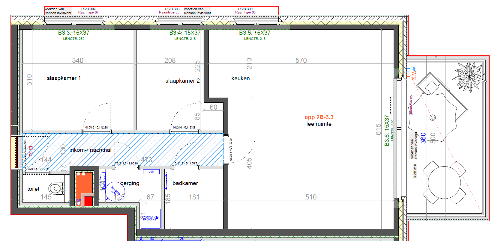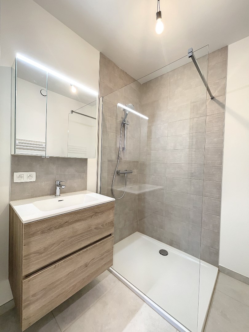 Allereerst is er een inkomhal met apart toilet. Vanuit de inkomhal heb je toegang tot de lichtrijke leefruimte met open keuken. Via het schuifraam krijgt u toegang tot het terras. Verder zijn er twee slaapkamers, een badkamer en een berging. In de ondergrondse parking is er nog een berging, een privé parkeerplaats en een gemeenschappelijke fietsenstalling voorzien.