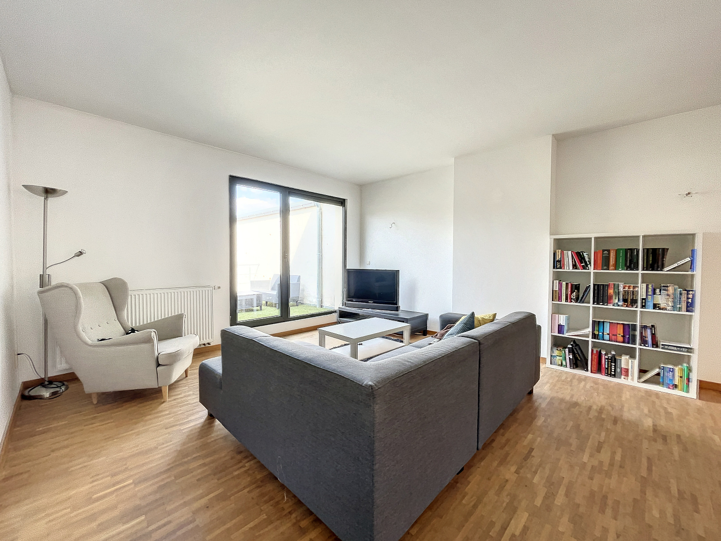 The apartment, located on the second floor, has an entrance hall with a separate toilet, a very spacious living room with big windows and a kitchen with a storage room. From the living room you have access to the terrace outside.