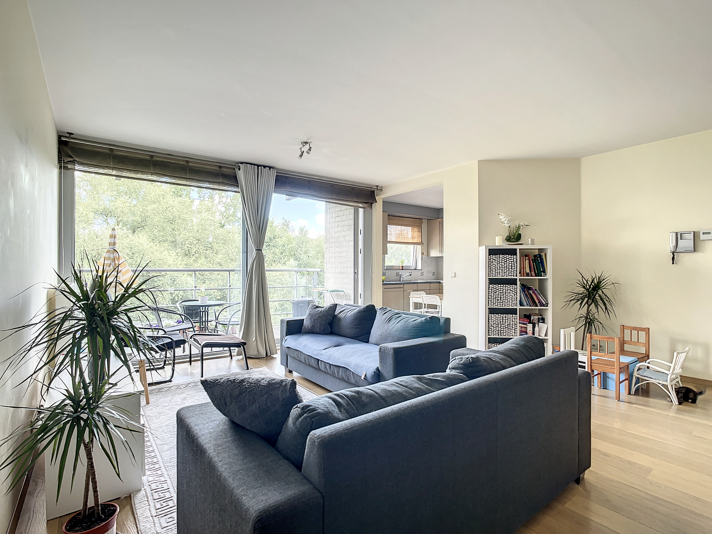Het lichtrijke appartement is gelegen op de derde verdieping en omvat een inkomhal met inbouwkasten, een apart toilet, 2 slaapkamers, een badkamer, een woonkamer met aansluitend de eetplaats, een ingerichte keuken voorzien van alle toestellen en een berging. Het grote schuifraam in de woonkamer geeft toegang tot het ruime terras. De autostaanplaats is inbegrepen in de prijs.