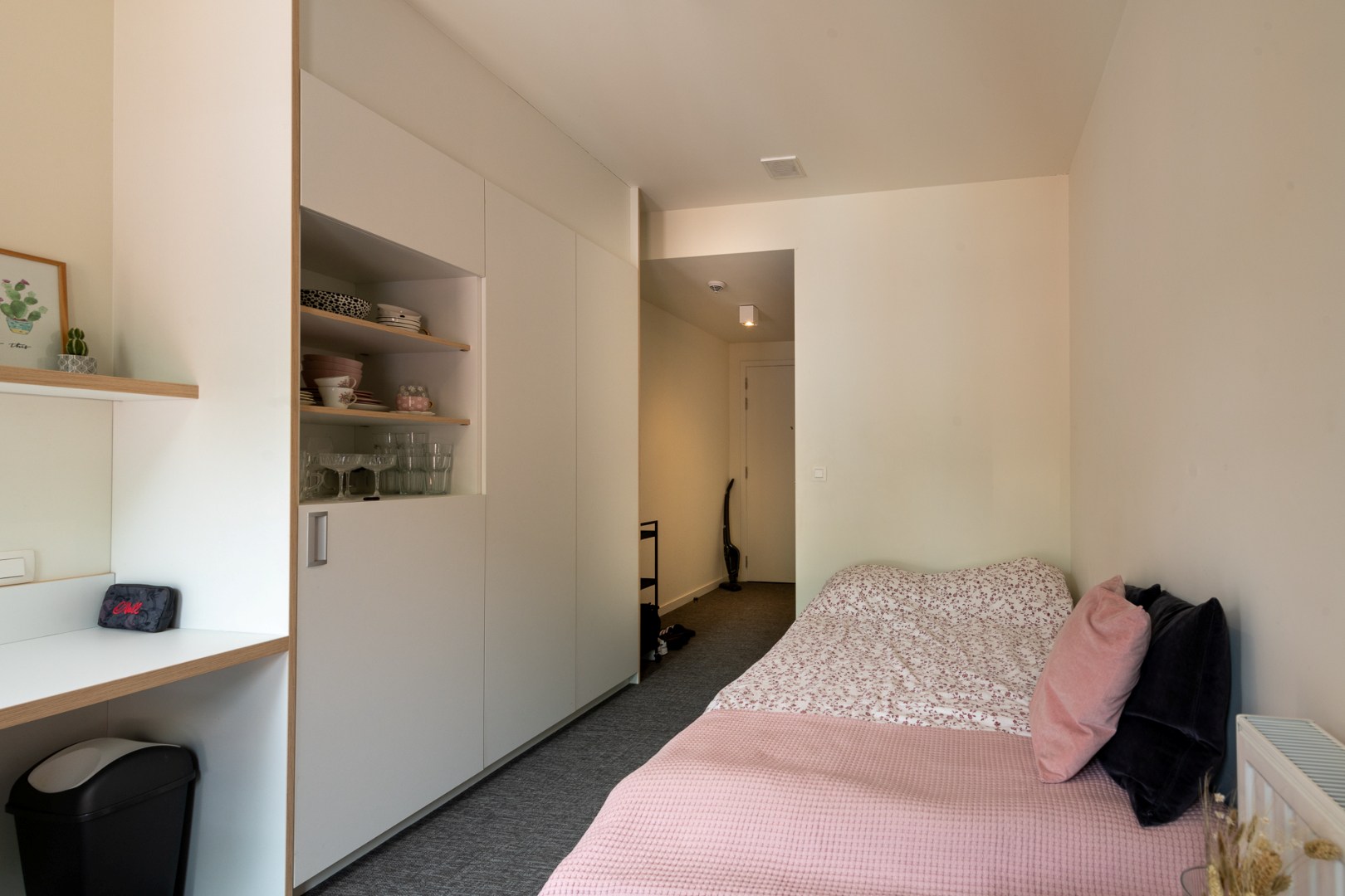 De kamer beschikt over een eigen badkamer, wat zorgt voor extra privacy en comfort. Een aangename, lichtrijke ruimte met een degelijk bureau biedt de perfecte omgeving om geconcentreerd te studeren. Het comfortabele bed en de praktische indeling maken van deze kamer een echte thuis, ook tijdens drukke examenperiodes.