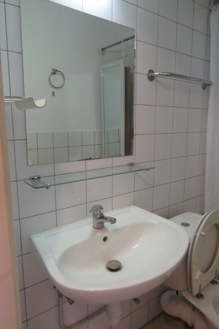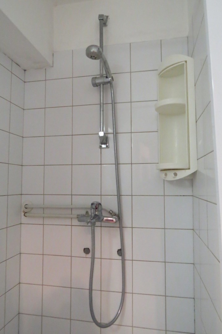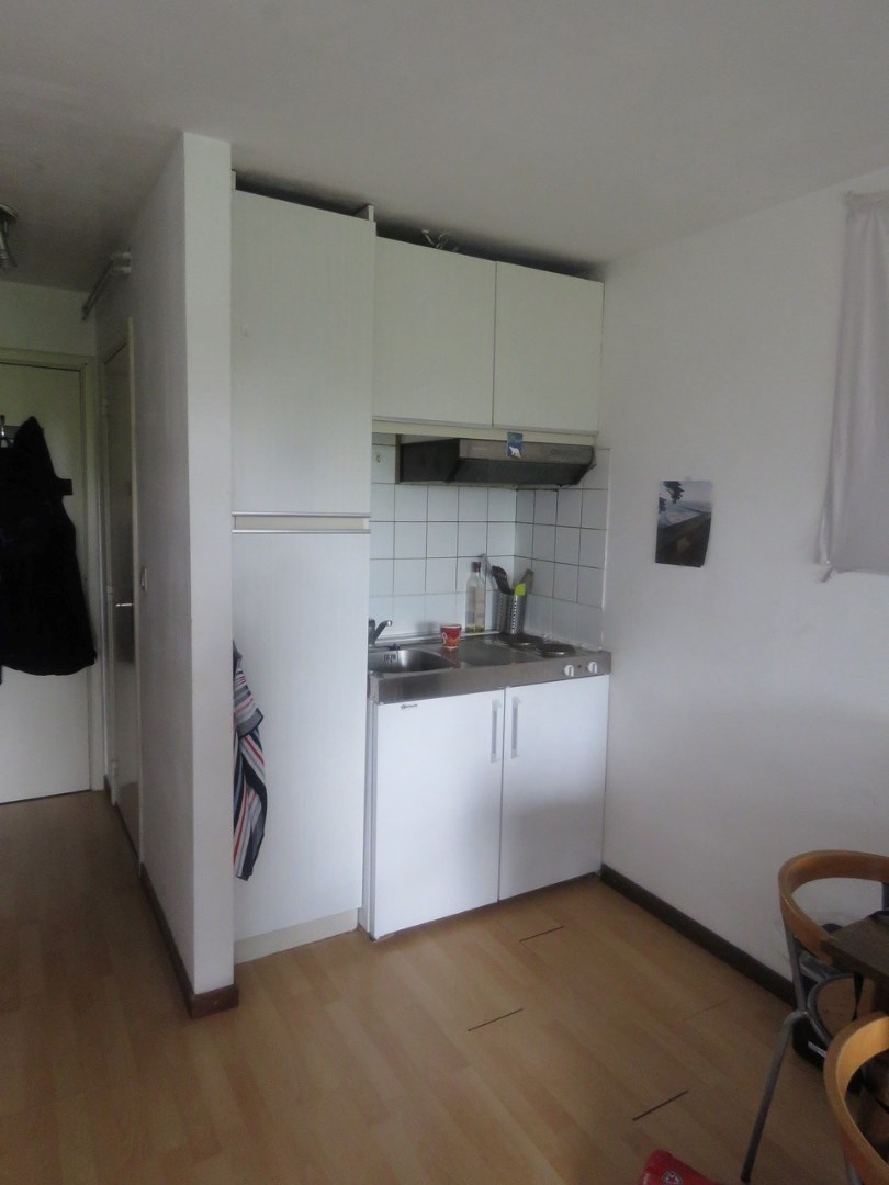 De studio omvat een woonkamer met open keuken, een aparte badkamer en een terras.