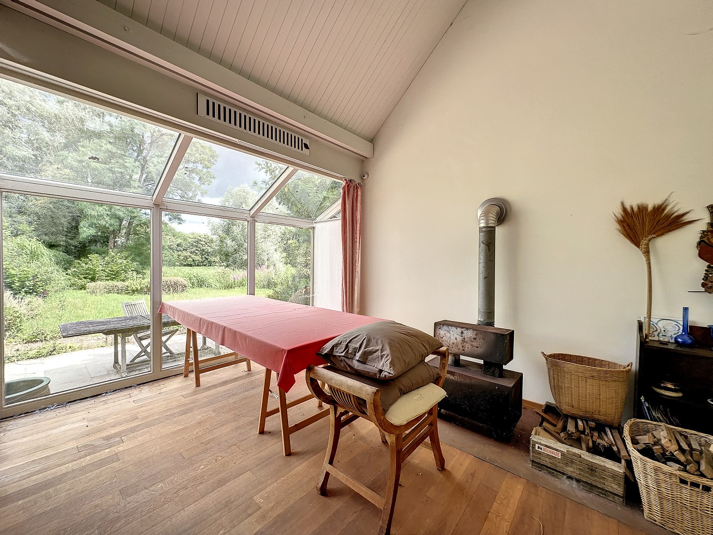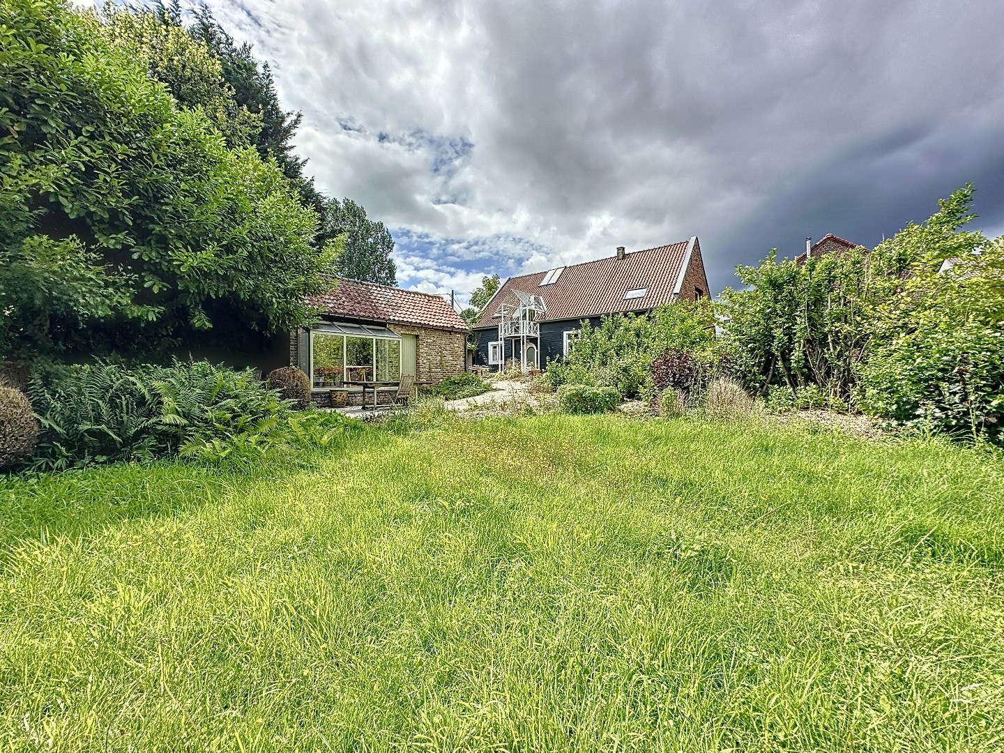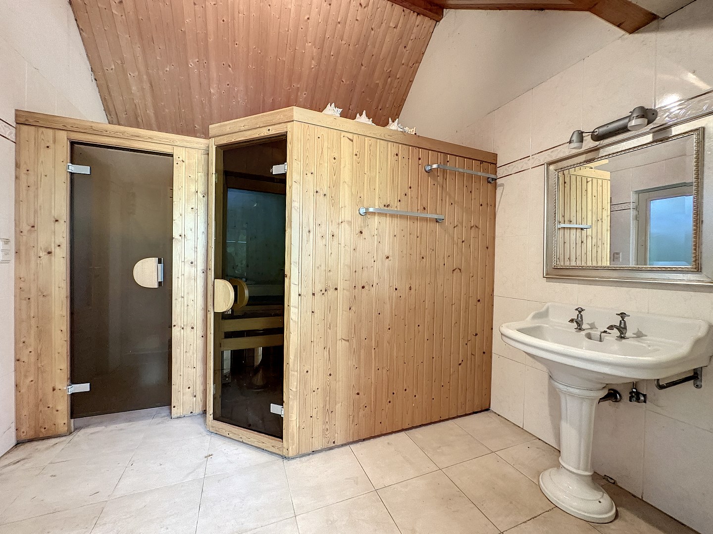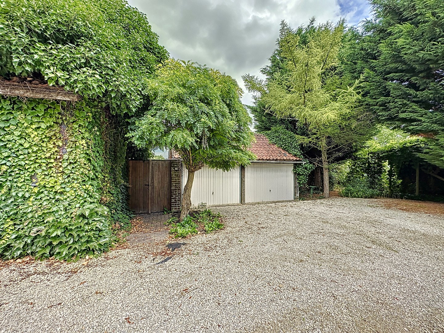 De 4 grote slaapkamers en 2 badkamers bevinden zich op de gelijkvloerse verdieping en staan met elkaar in contact via de ruime inkomhal. Leefruimte, keuken en bureau bevinden zich op de eerste verdieping. Tenslotte beschikt de woning ook over twee garages, een ruime werkplaats en een bijhuisje dat nog naar believen kan gemoderniseerd en ingericht worden.