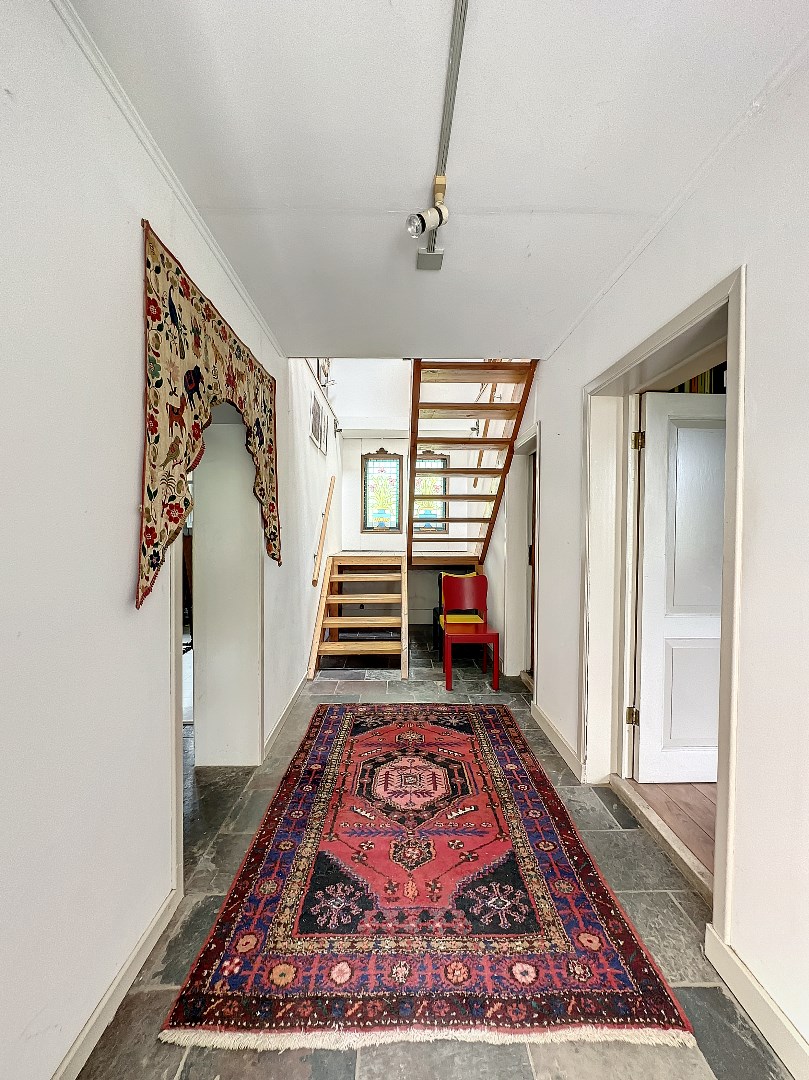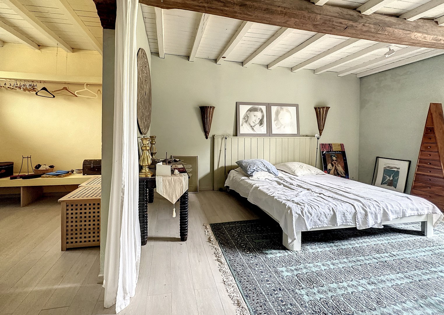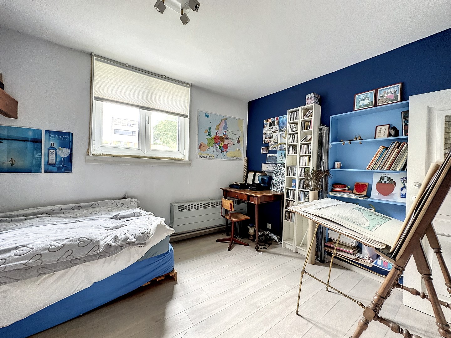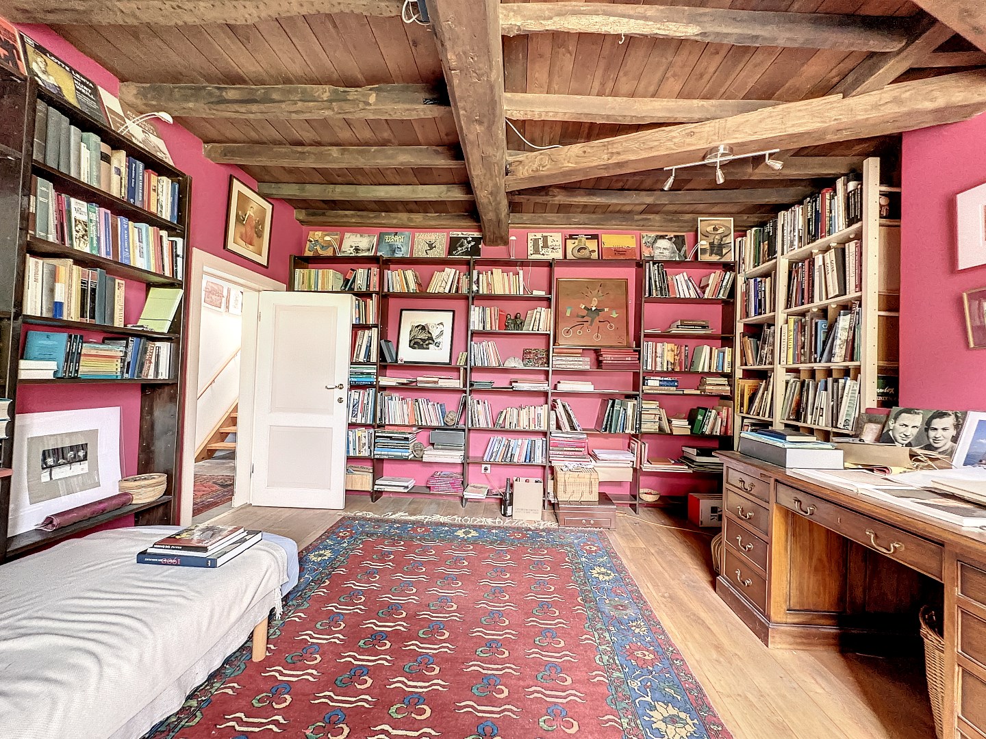 De 4 grote slaapkamers en 2 badkamers bevinden zich op de gelijkvloerse verdieping en staan met elkaar in contact via de ruime inkomhal. Leefruimte, keuken en bureau bevinden zich op de eerste verdieping. Tenslotte beschikt de woning ook over twee garages, een ruime werkplaats en een bijhuisje dat nog naar believen kan gemoderniseerd en ingericht worden.