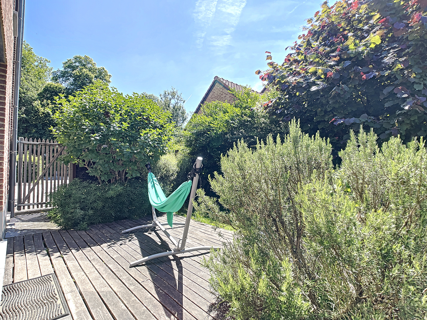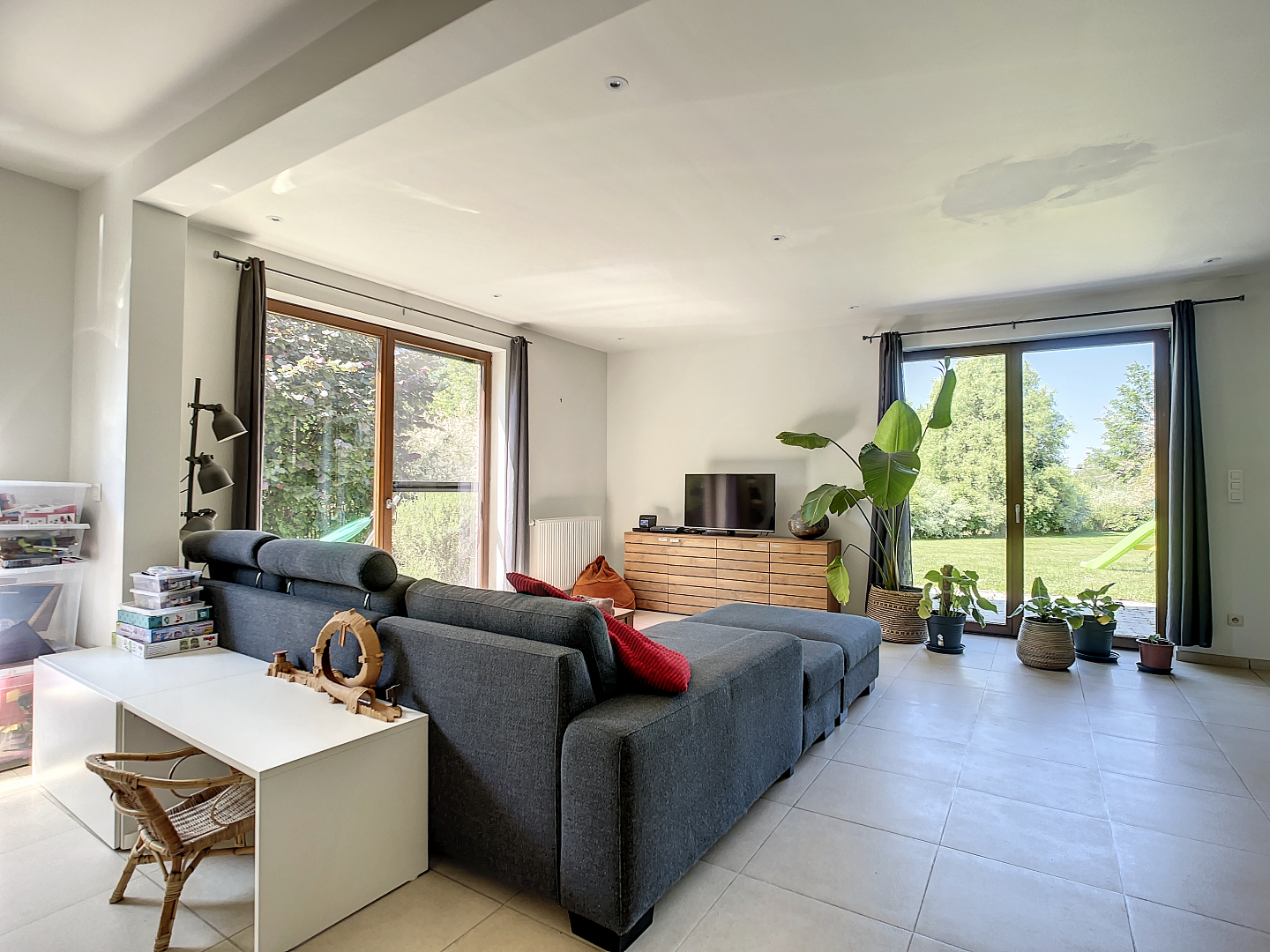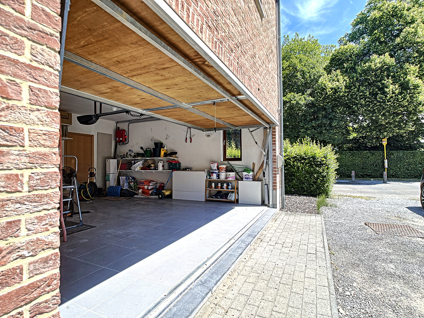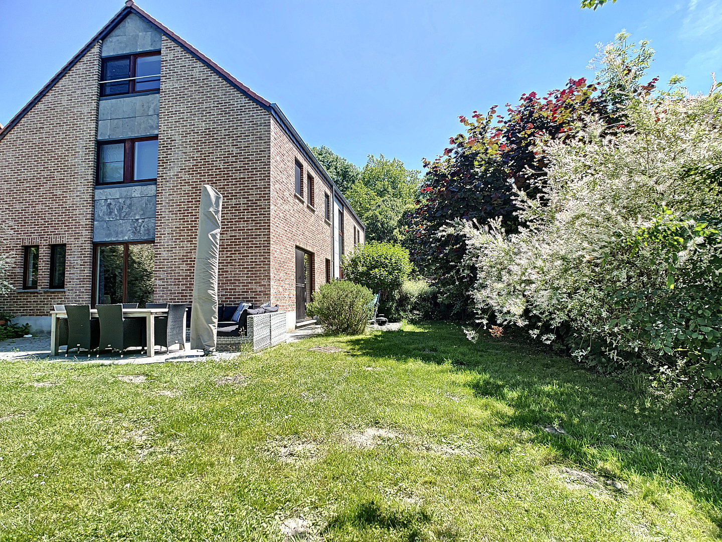 Op het gelijkvloers: een zeer ruime inkomhal, dubbele garage, wasplaats/berging, apart toilet, leefruimte met open keuken en toegang tot de prachtige tuin met terras en een extra zonneterras.
