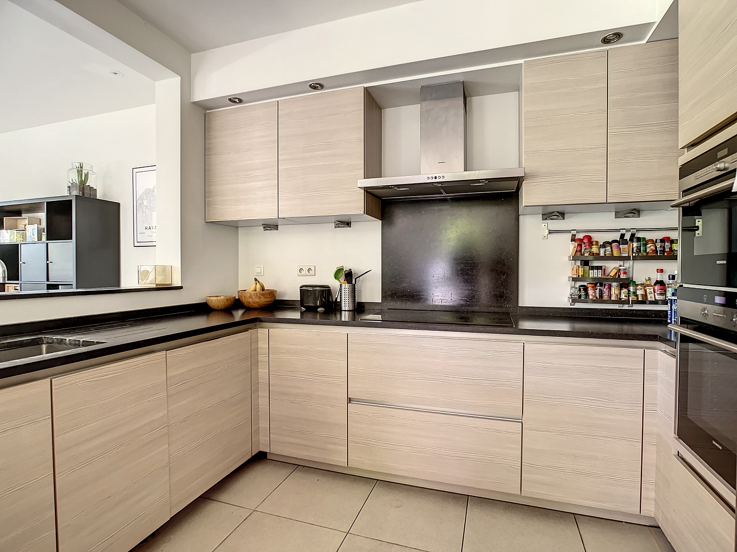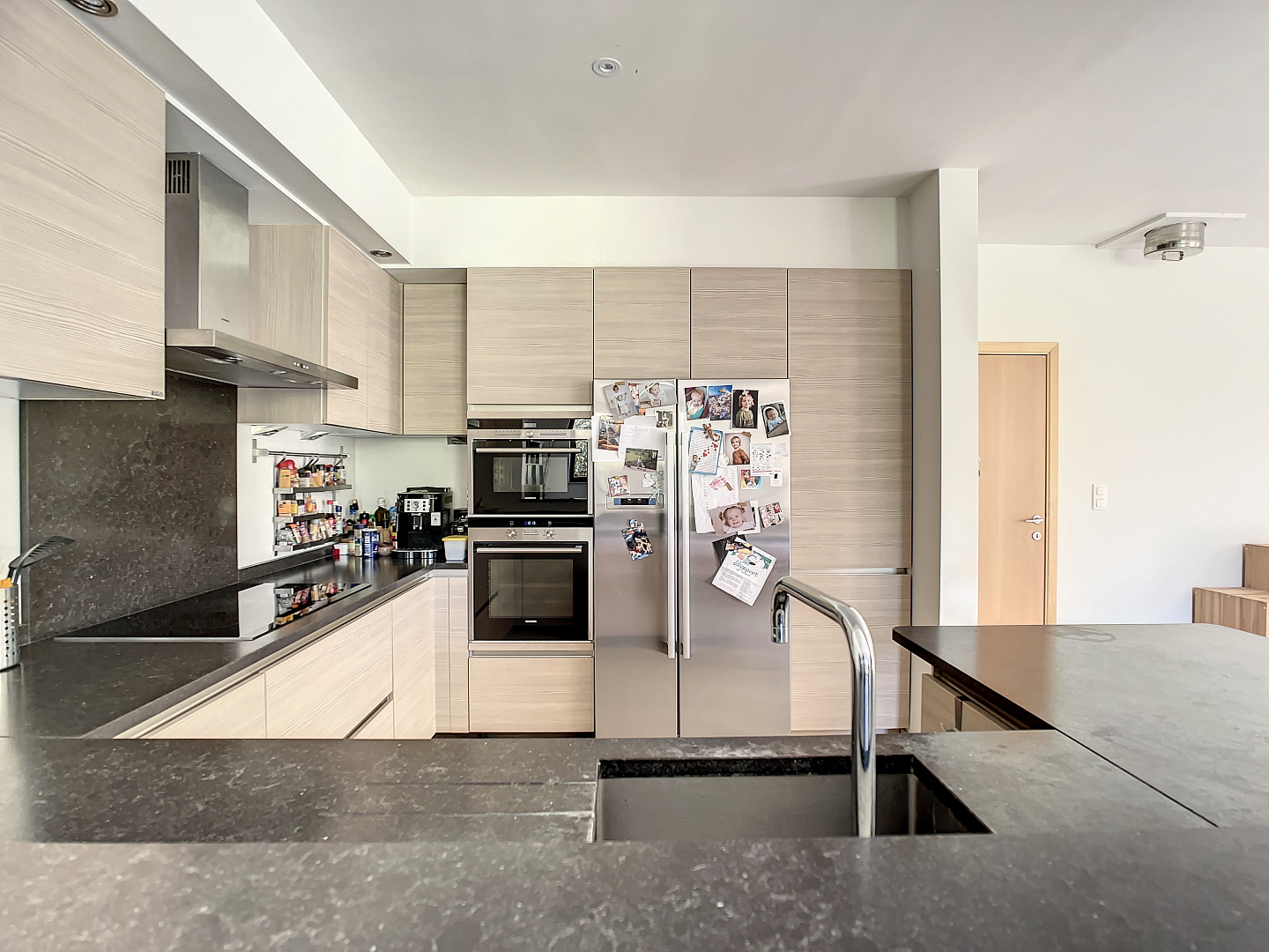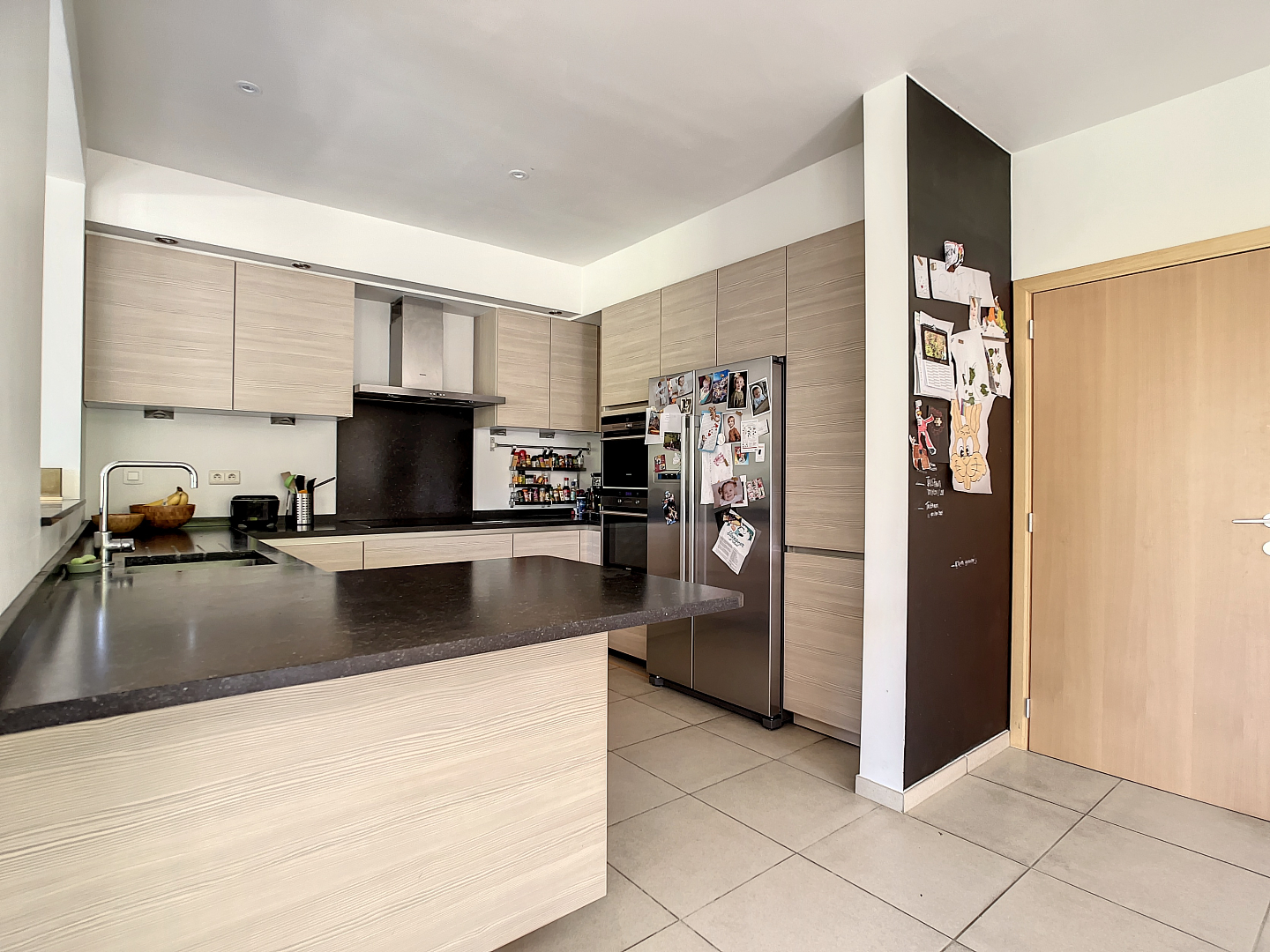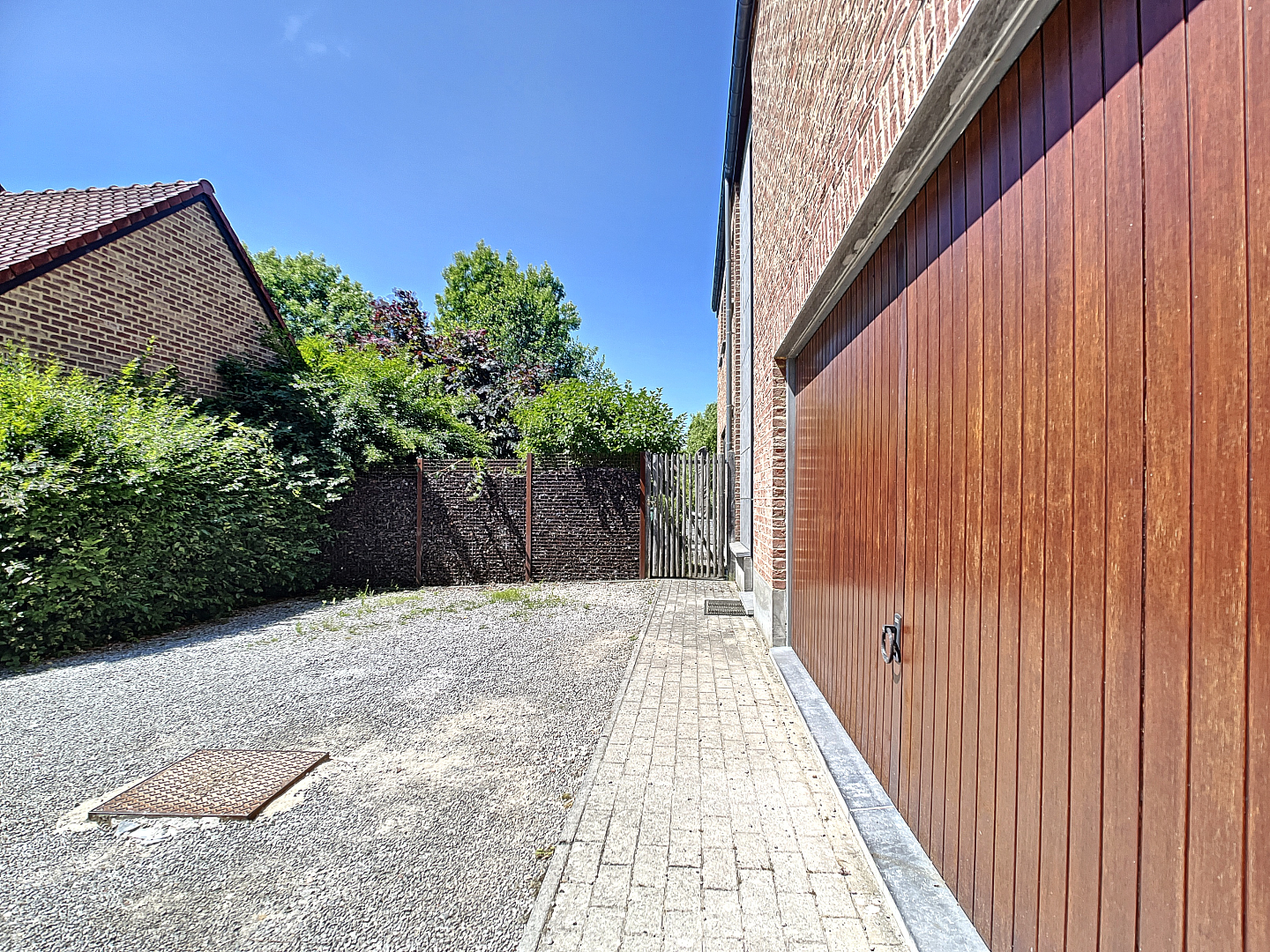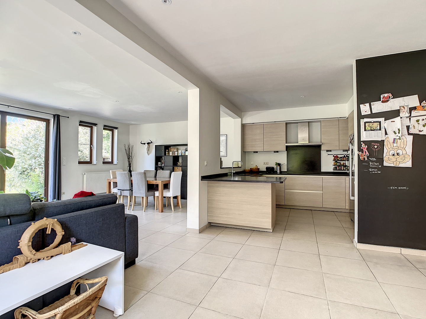 Op het gelijkvloers: een zeer ruime inkomhal, dubbele garage, wasplaats/berging, apart toilet, leefruimte met open keuken en toegang tot de prachtige tuin met terras en een extra zonneterras.