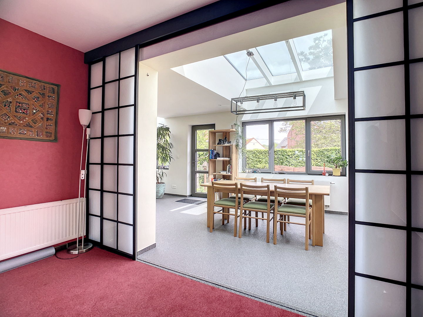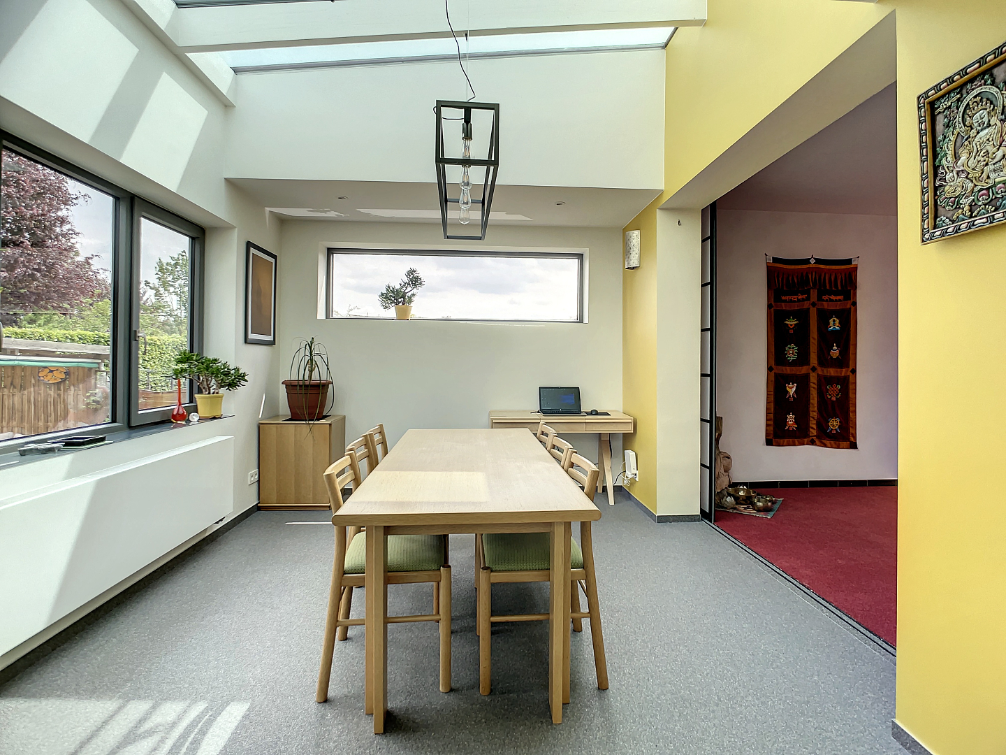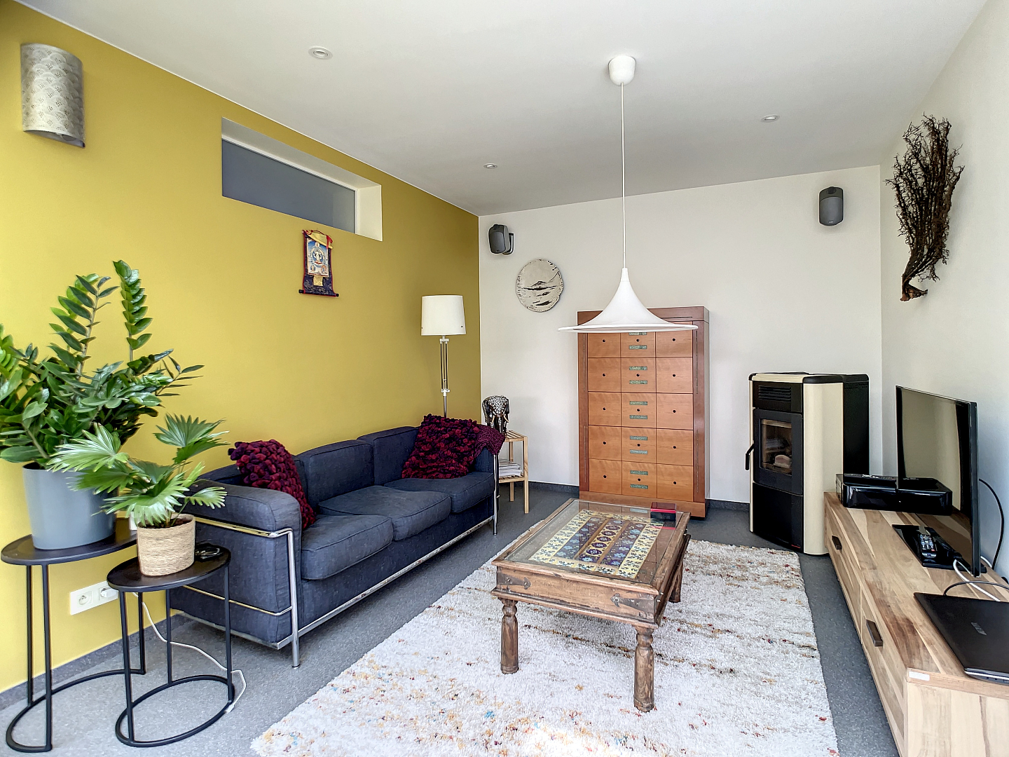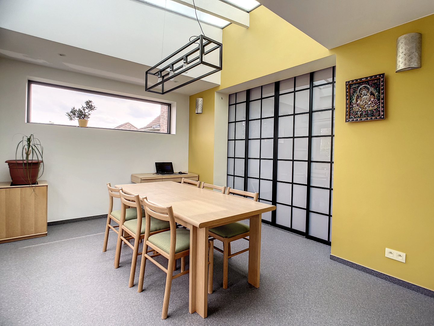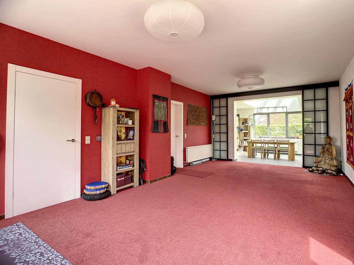 De woning beschikt over een inkomhal met toilet, een ruime leefruimte met eetkamer, woonkamer en open keuken. Een deel van de leefruimte werd tot op de dag van vandaag gebruikt als yogaruimte. Deze ruimte kan perfect gebruikt worden als leefruimte, praktijkruimte, extra slaapkamer, …..