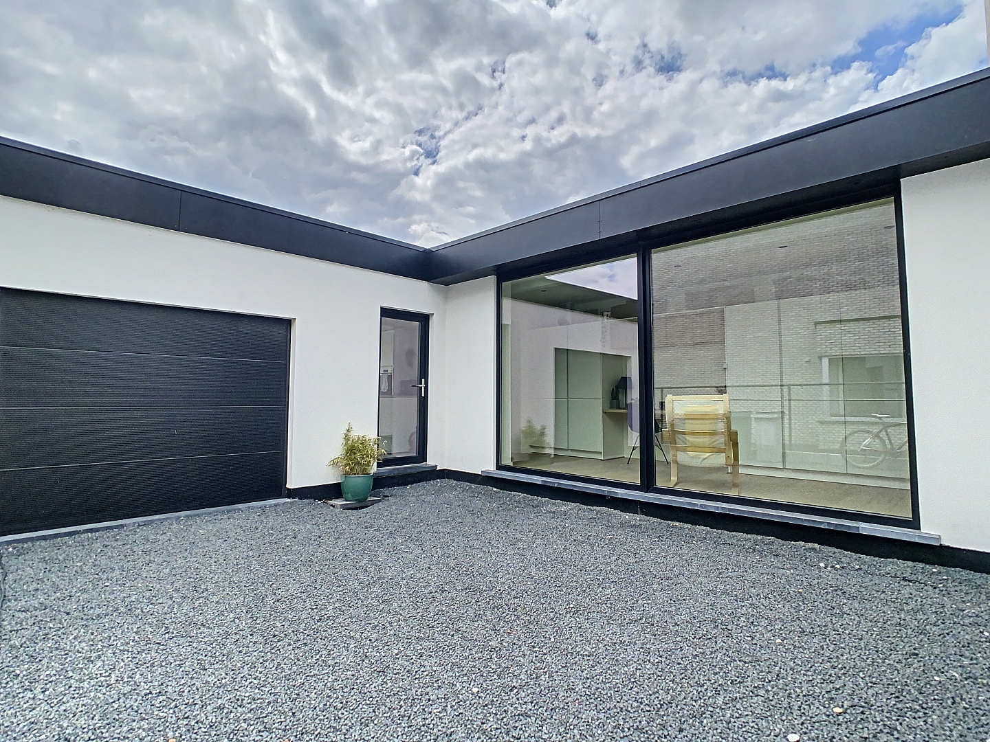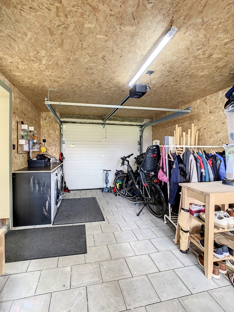 Op het gelijkvloers vindt u een inkomhal, apart toilet, leefruimte, tussenstuk met inbouwkasten en bureau, volledig geïnstalleerde keuken en aansluitend de garage met wasplaats en berging.