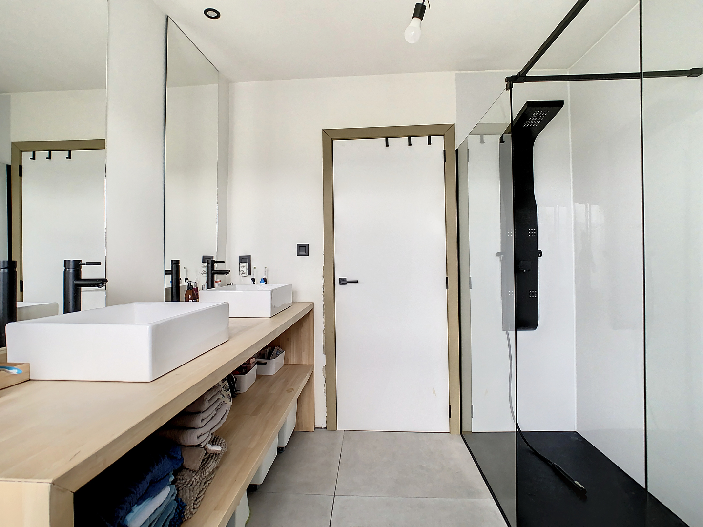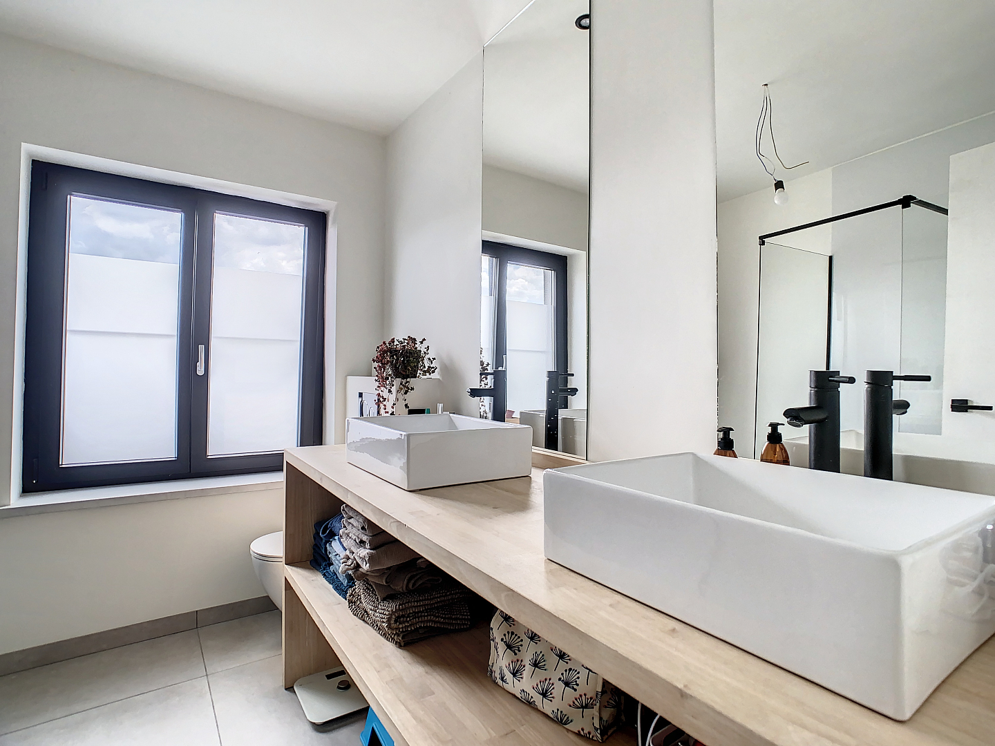 Op het eerste verdiep vindt u 2 ruime kamers en de badkamer met prachtige inloopdouche, 2 lavabo's en een toilet.