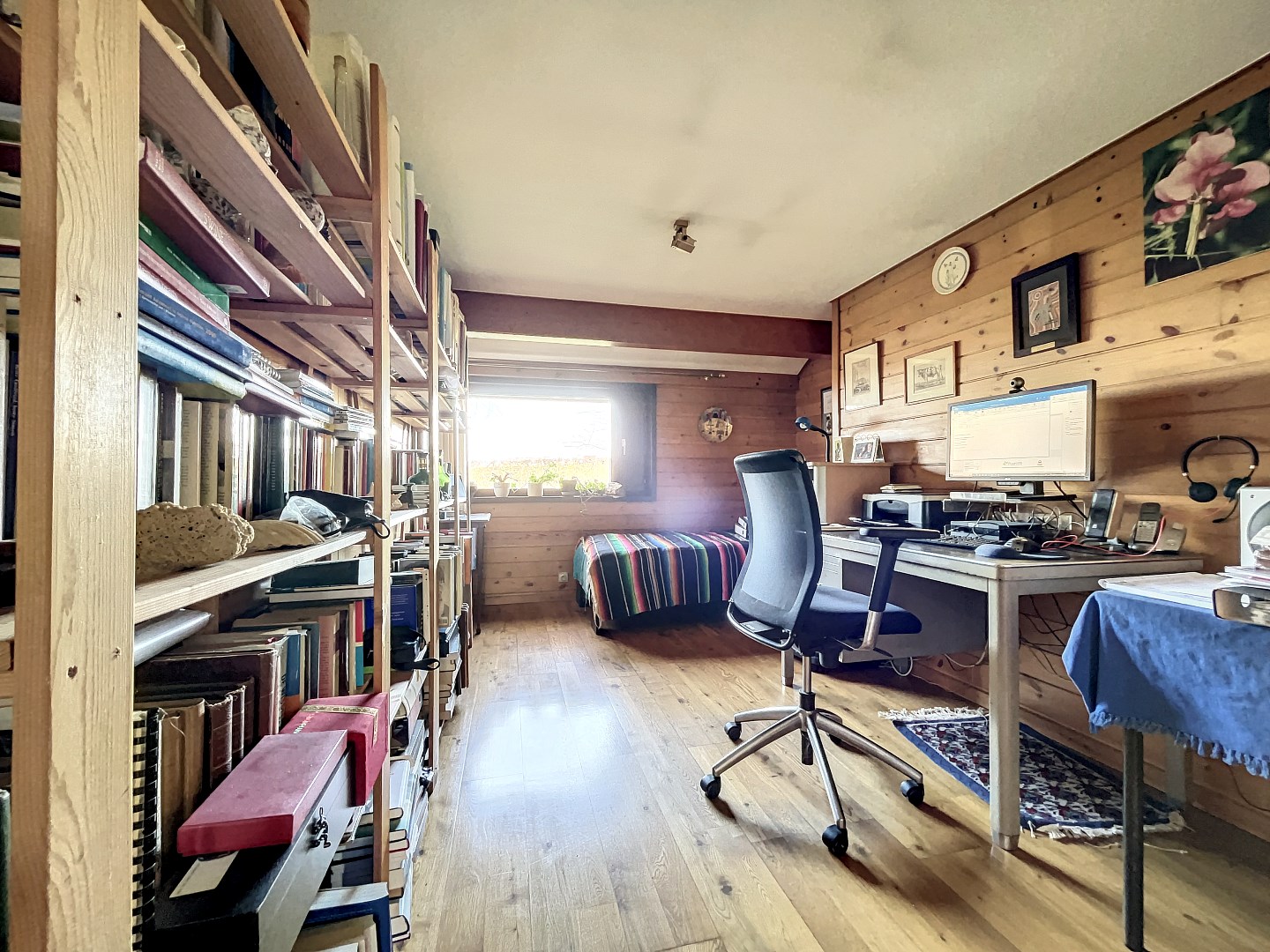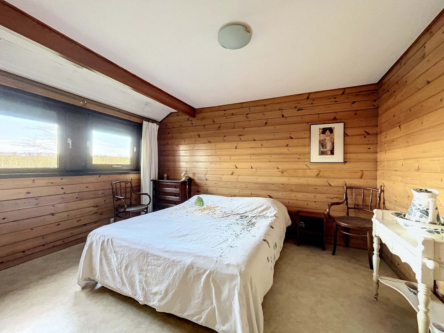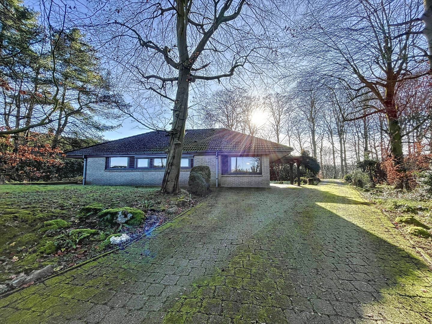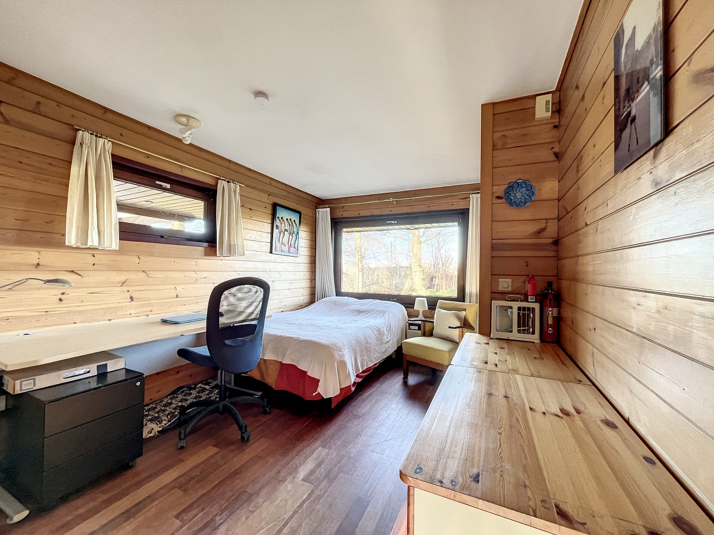 De woning is volledig gelijkvloers. Via de inkomhal kom je terecht in de rustieke open leefruimte met veel raampartijen en zicht op de tuin. Vanuit de leefruimte heb je toegang tot de keuken en bureau. Verder heb je de master bedroom met aansluitend de badkamer en een dressing! Bovendien is er nog een tweede slaapkamer, een berging en een zolder welke perfect gebruikt kan worden als opslagruimte.