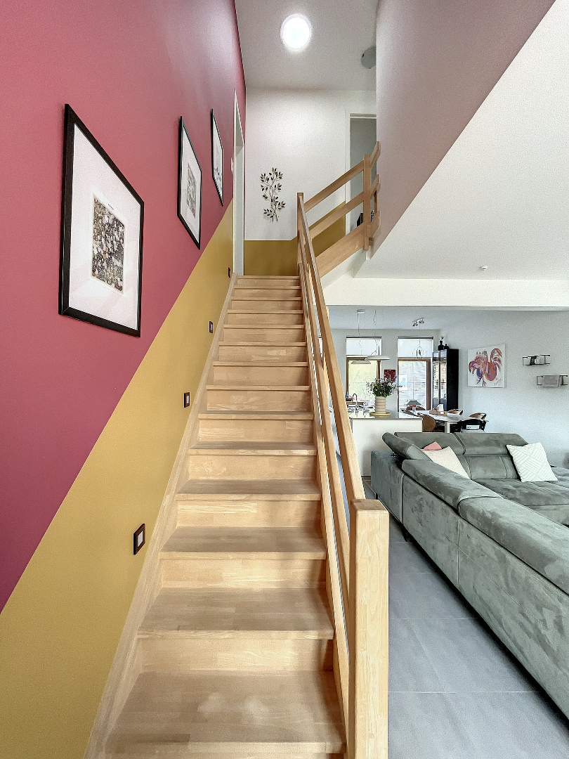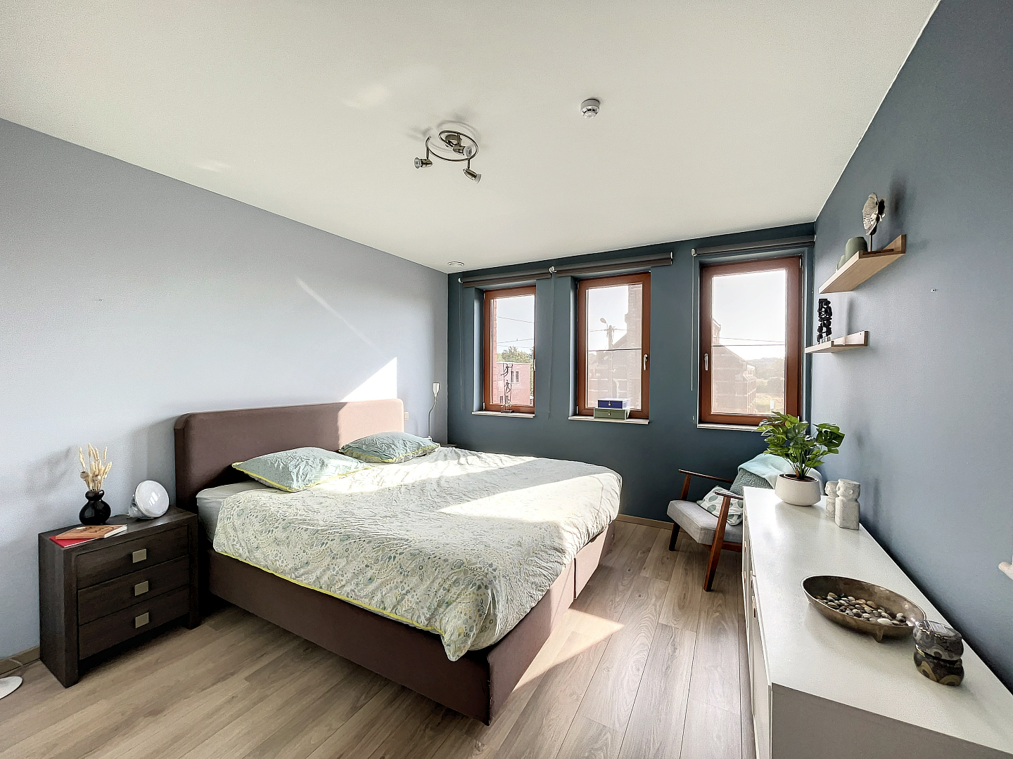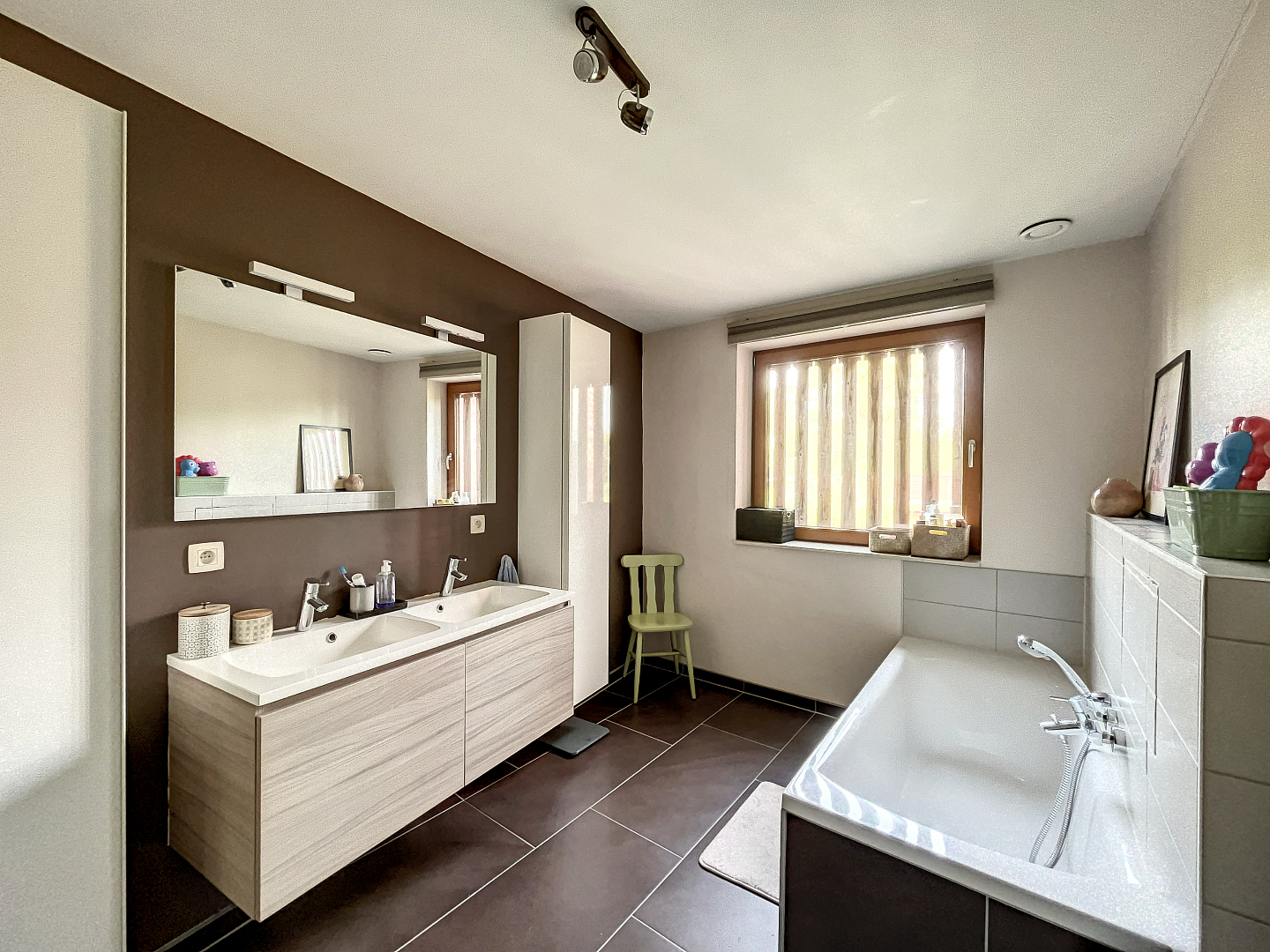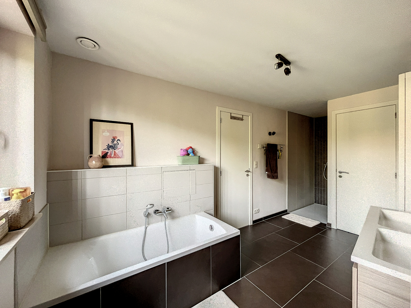 Op het eerste verdiep zijn er drie kamers en een grote badkamer met inloopdouche, bad, dubbele lavabo en een apart toilet.