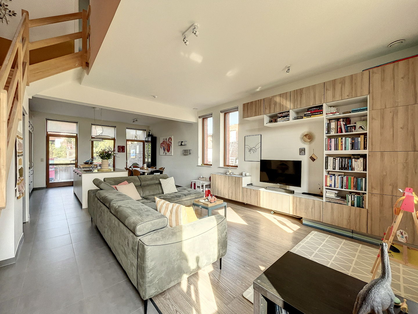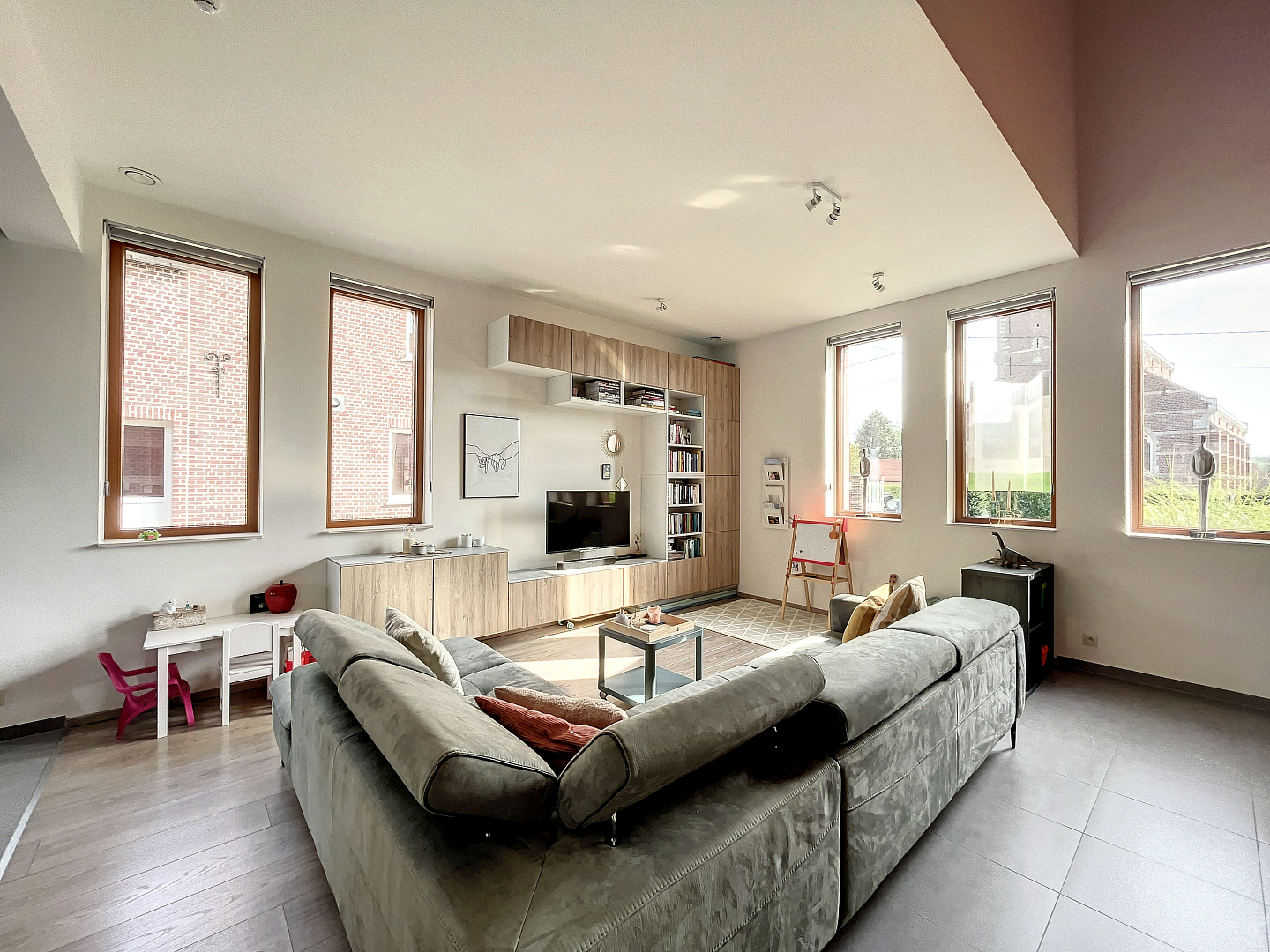 Wanneer je de woning betreedt kom je in de inkomhal met apart toilet. Van hieruit ga je naar de lichtrijke leefruimte met living, eetplaats en volledig geïnstalleerde open keuken. De hoge plafonds creëren mee het gevoel van ruimte en openheid. Verder is er ook een berging met aansluiting voor je wasmachine en droogkast.