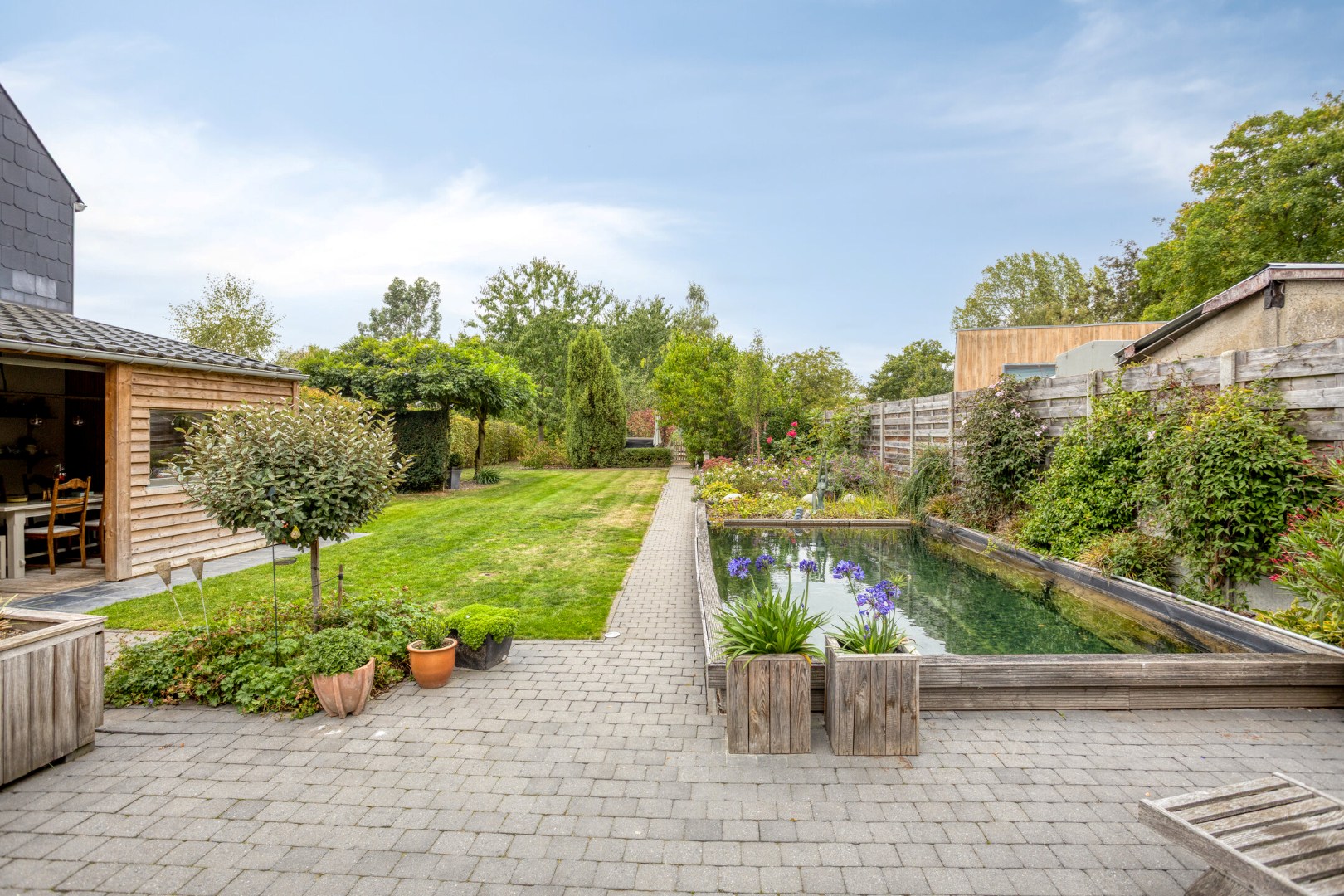 De tuin is een waar pareltje: een zwemvijver, sauna en pizzaoven maken van elke zomerdag een vakantiegevoel in eigen huis. Daarbij is er ook voldoende parkeergelegenheid voor meerdere wagens.