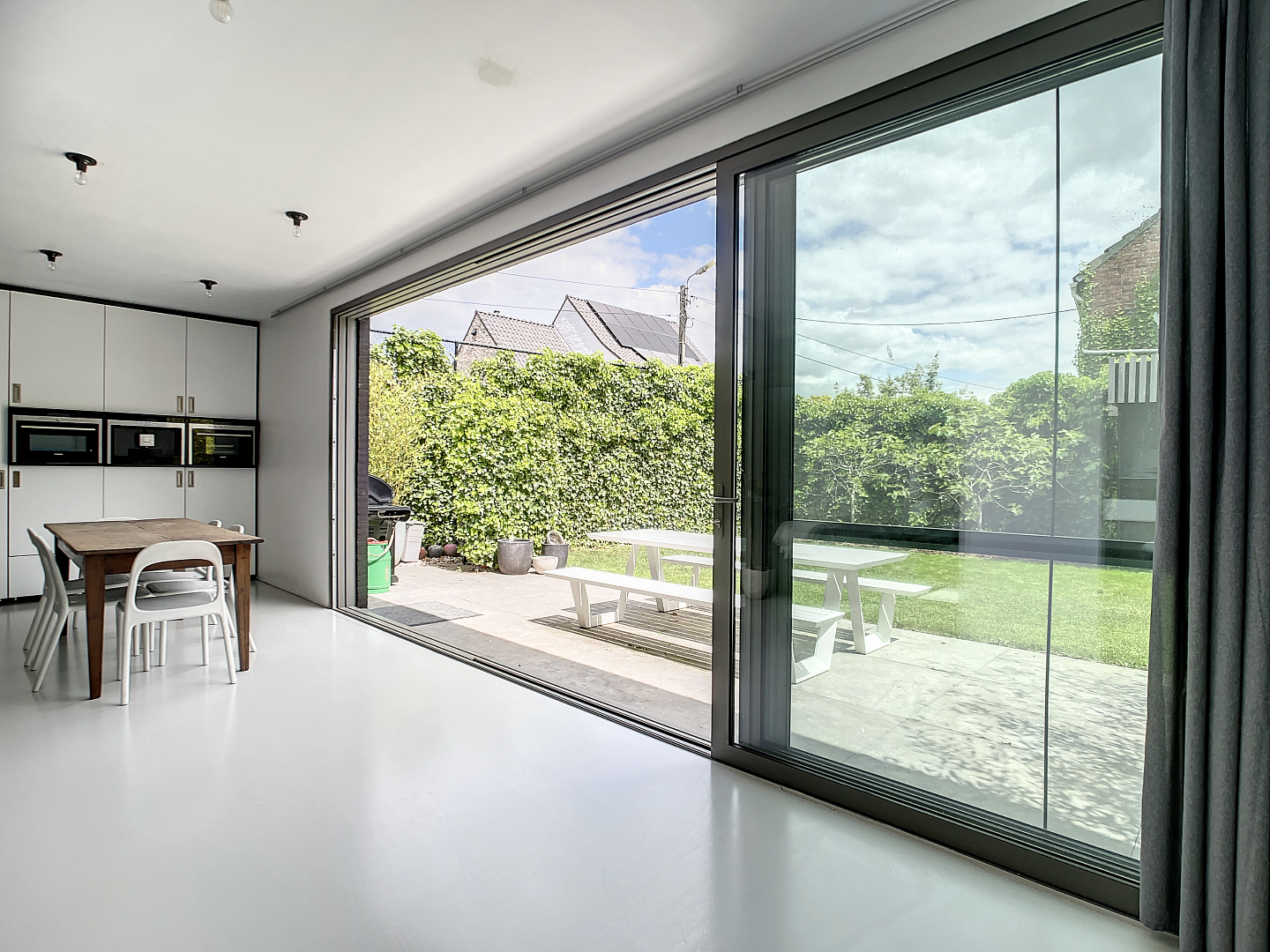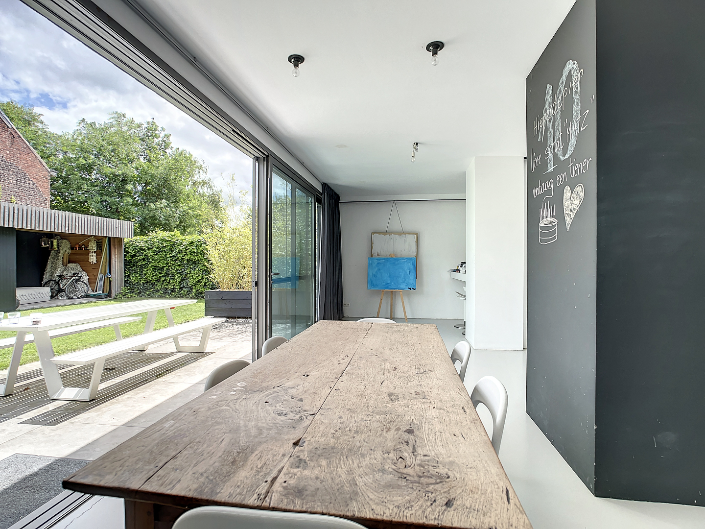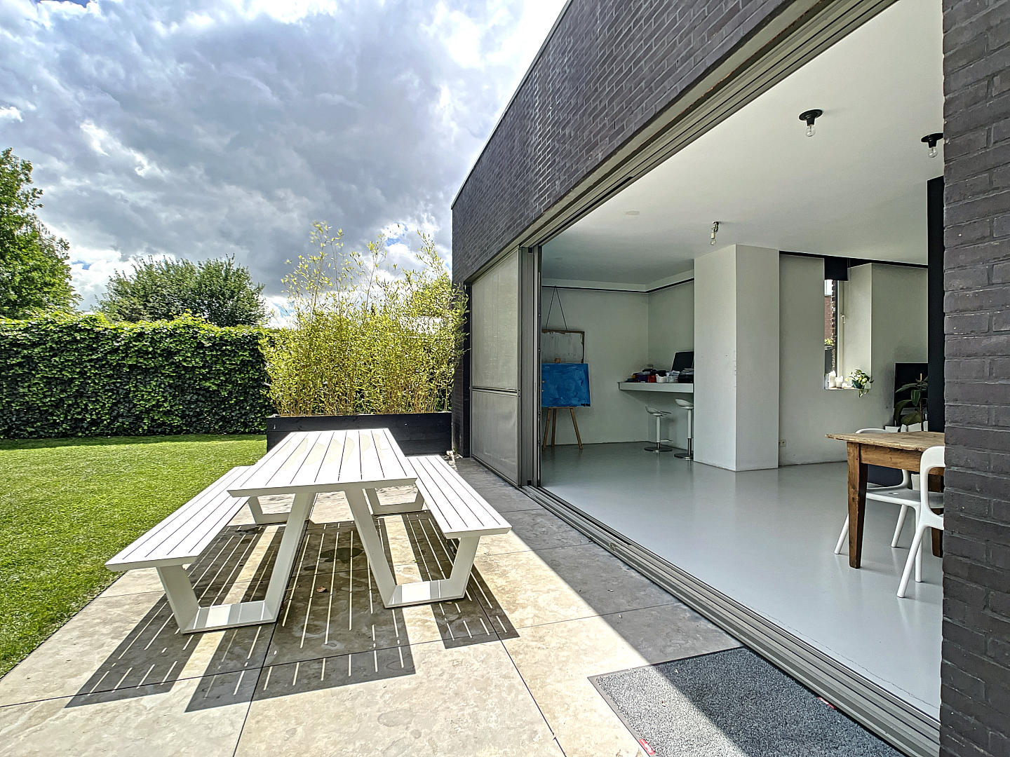 Via de grote raampartij in de leefruimte (die volledig open kan) kom je in de aangelegde tuin met ruim terras, buitendouche en tuinhuis. Vooraan aan de woning zijn er staanplaatsen voor 3 wagens voorzien.