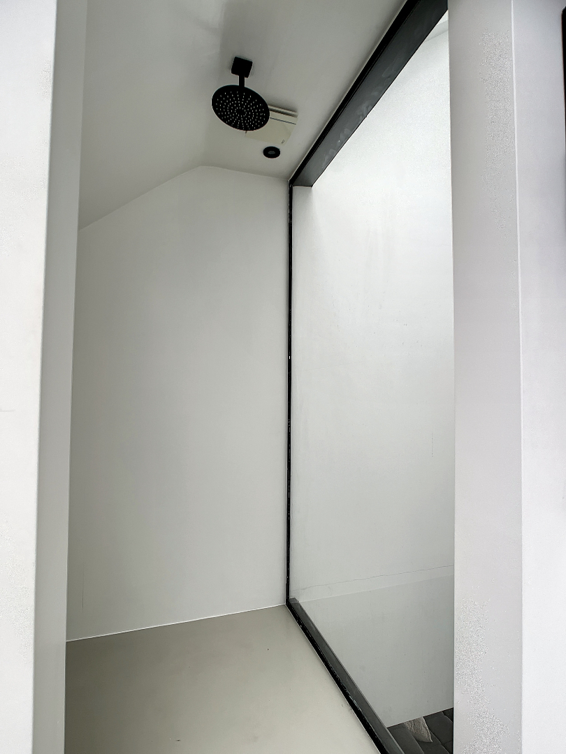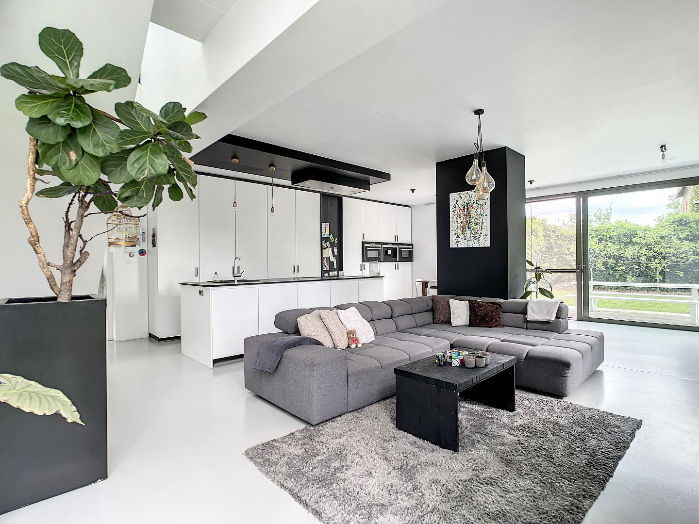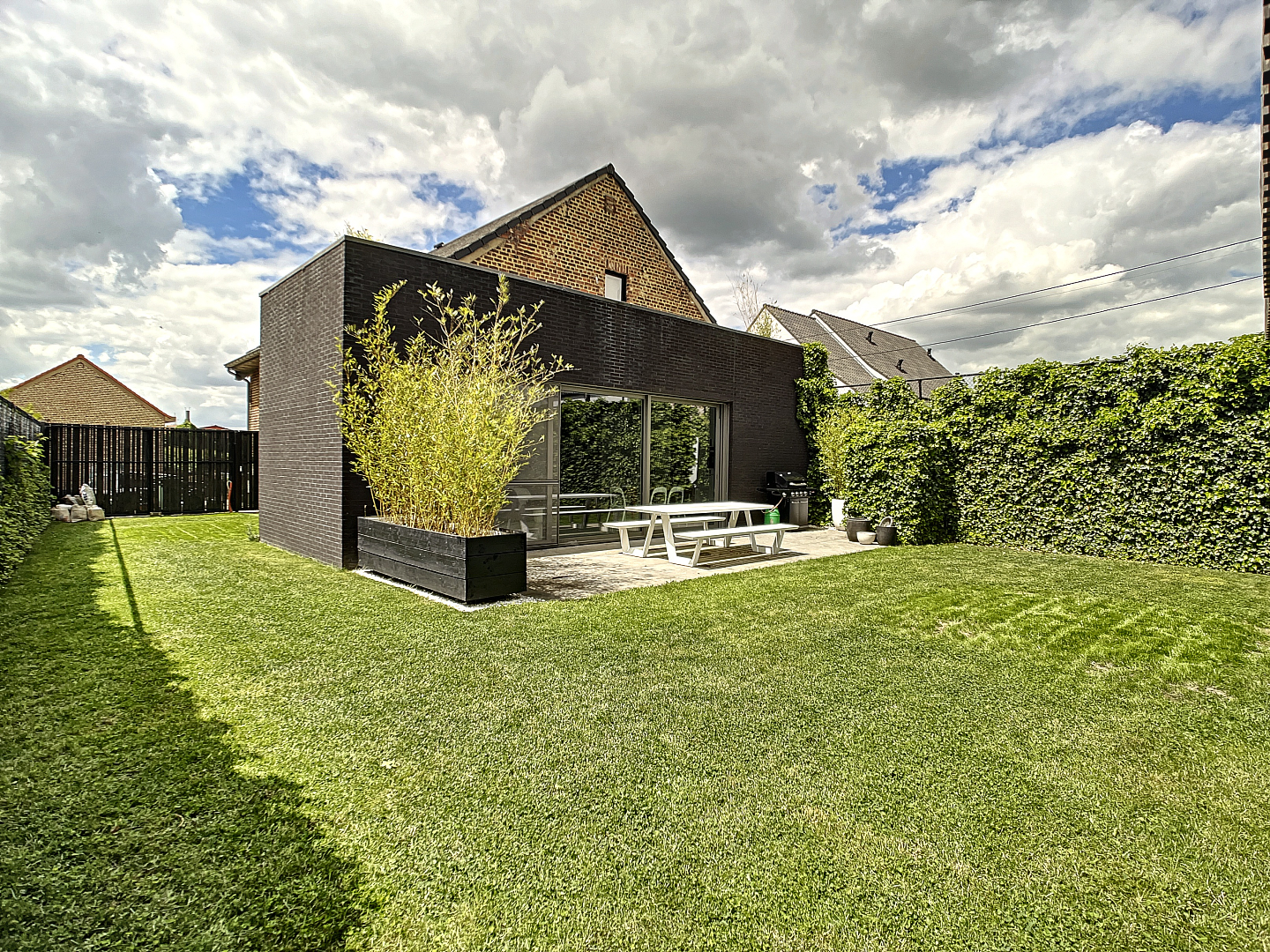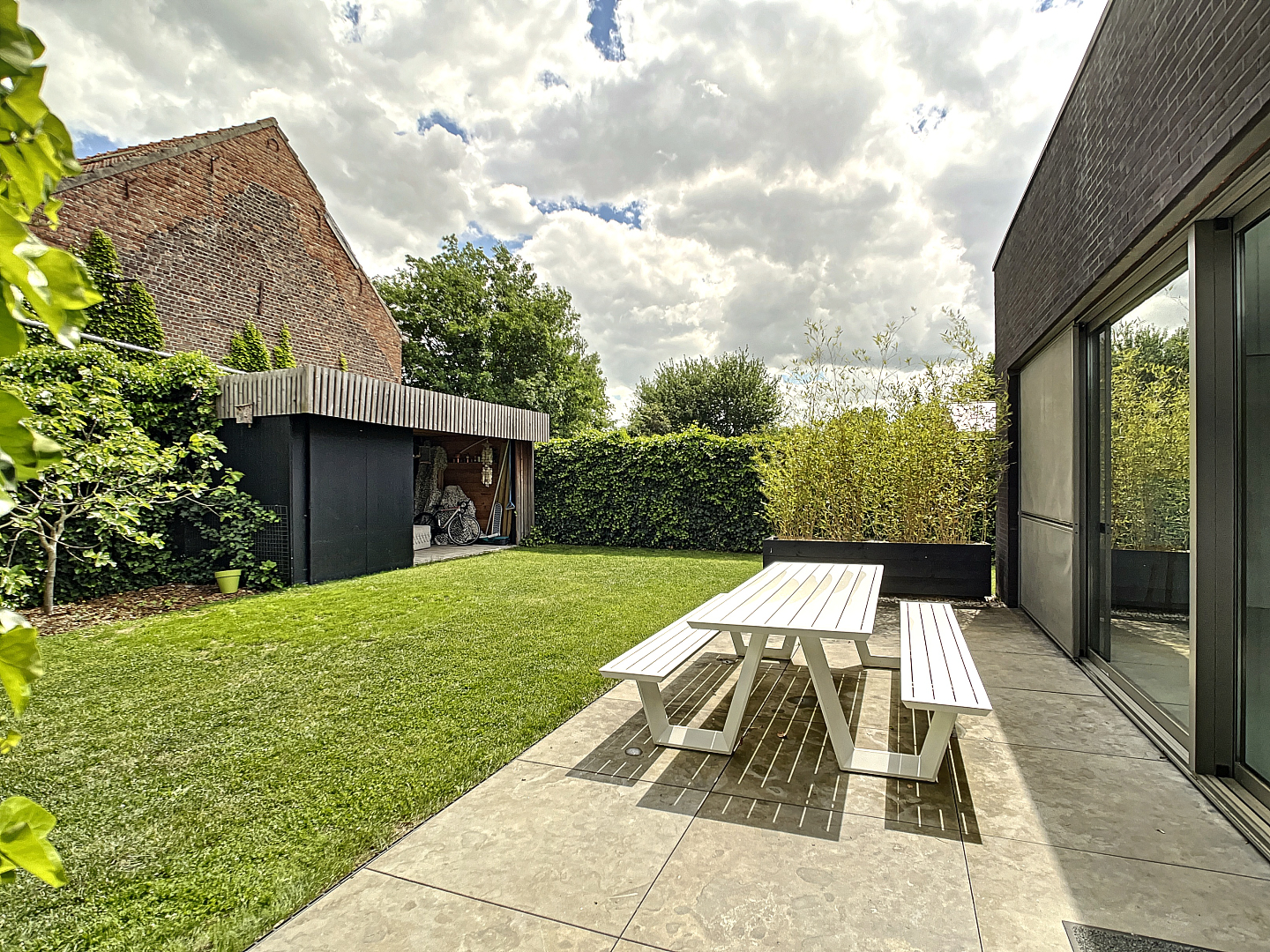 Via de grote raampartij in de leefruimte (die volledig open kan) kom je in de aangelegde tuin met ruim terras, buitendouche en tuinhuis. Vooraan aan de woning zijn er staanplaatsen voor 3 wagens voorzien.