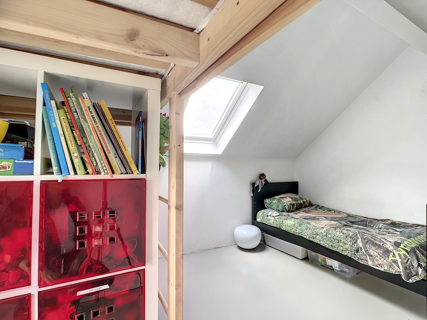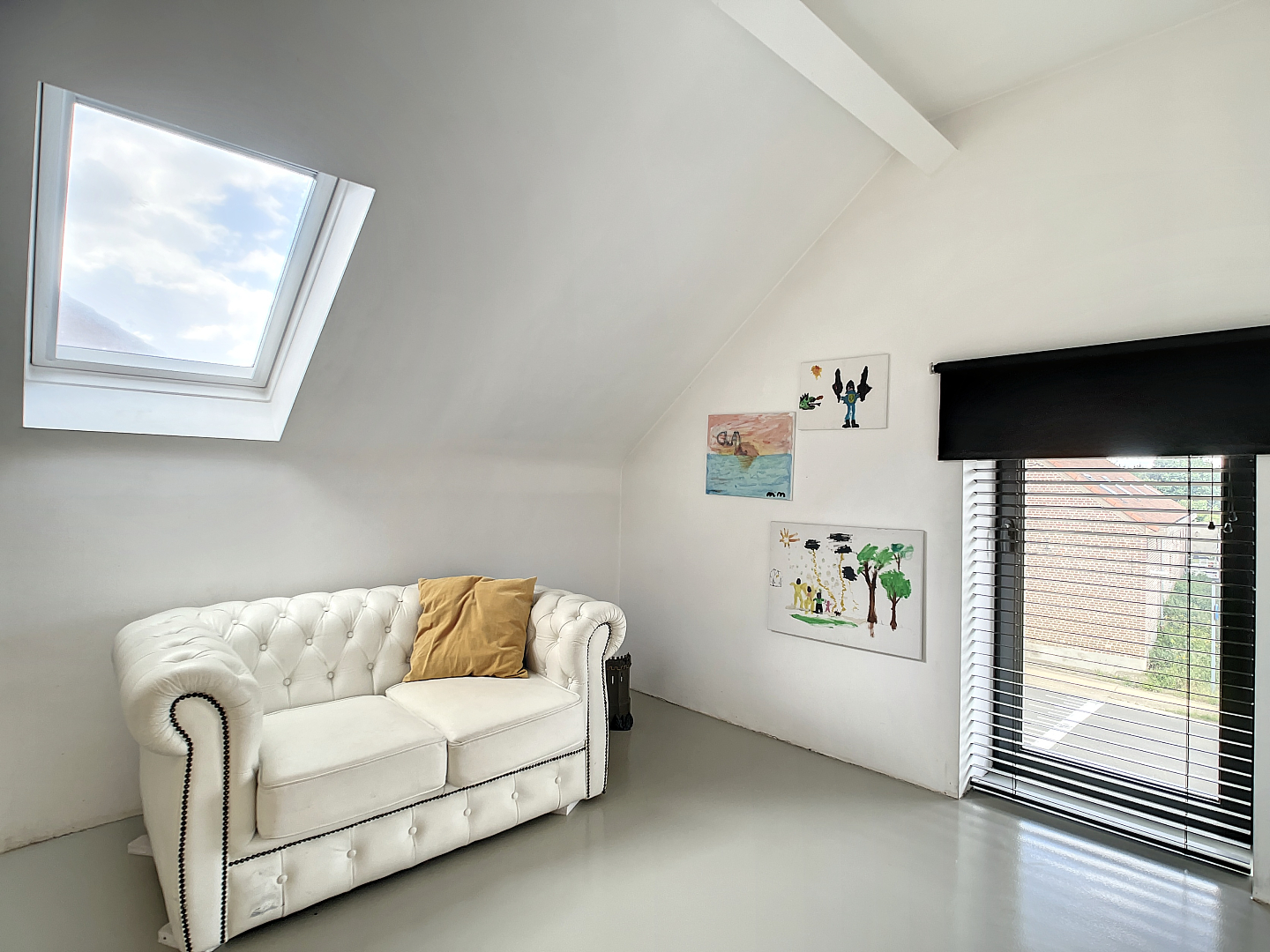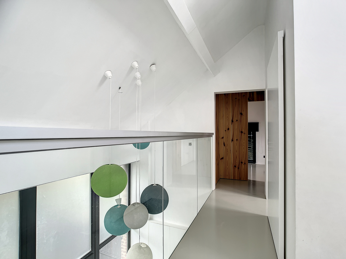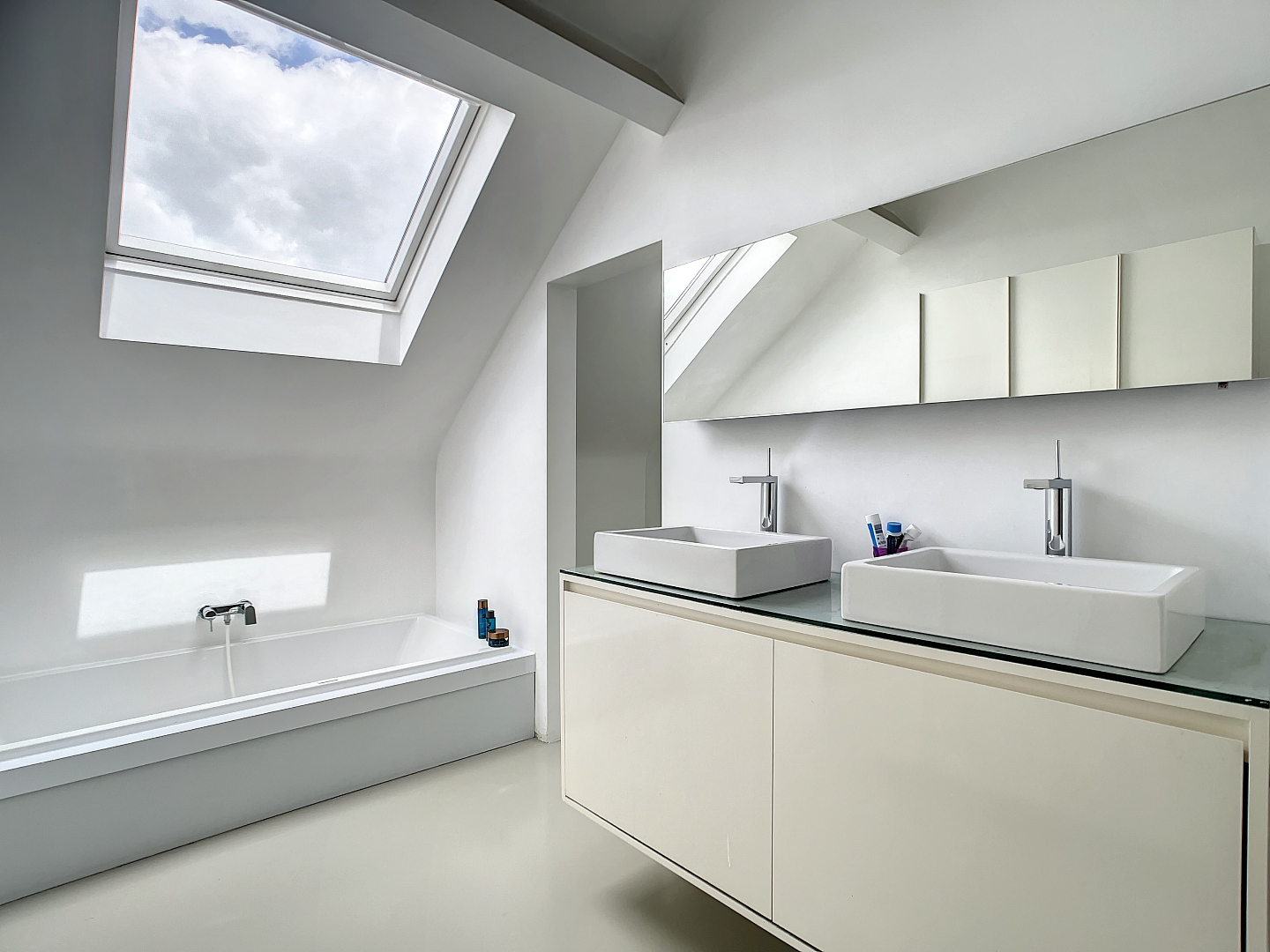 Op het verdiep kom je via de prachtige nachthal, met zicht op de inkomhal, in de master bedroom, met dressing en dakterras. Verder zijn er nog 2 ruime kamers met inbouwkasten en is er een badkamer met toilet, dubbele lavabo, groot bad en een prachtige inloopdouche. Tevens is er toegang tot de zolder via een zolderluik die dient als opbergruimte.