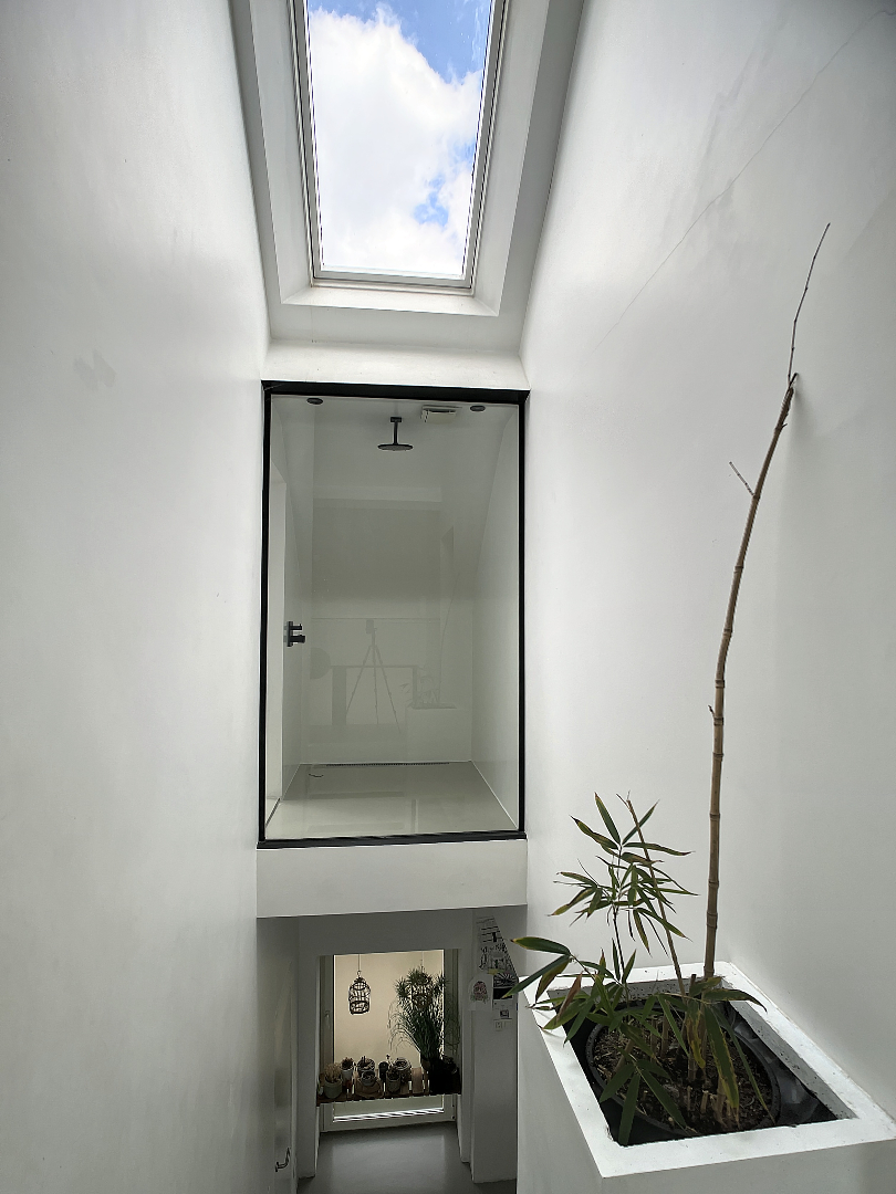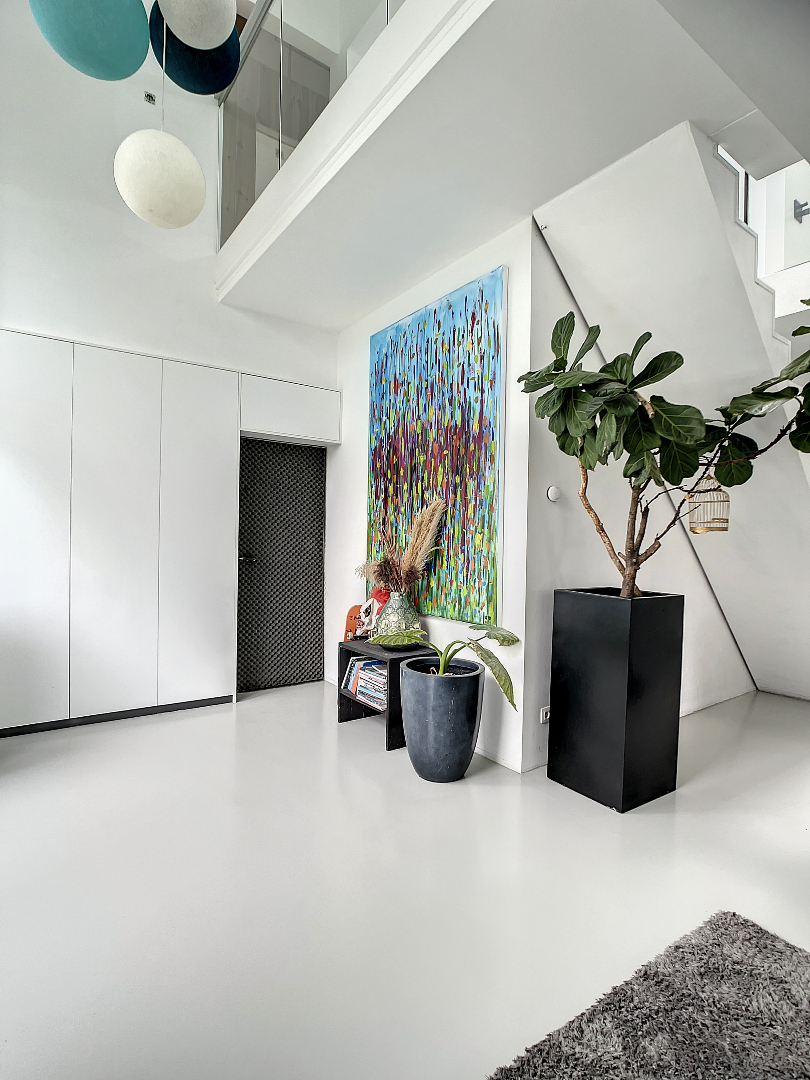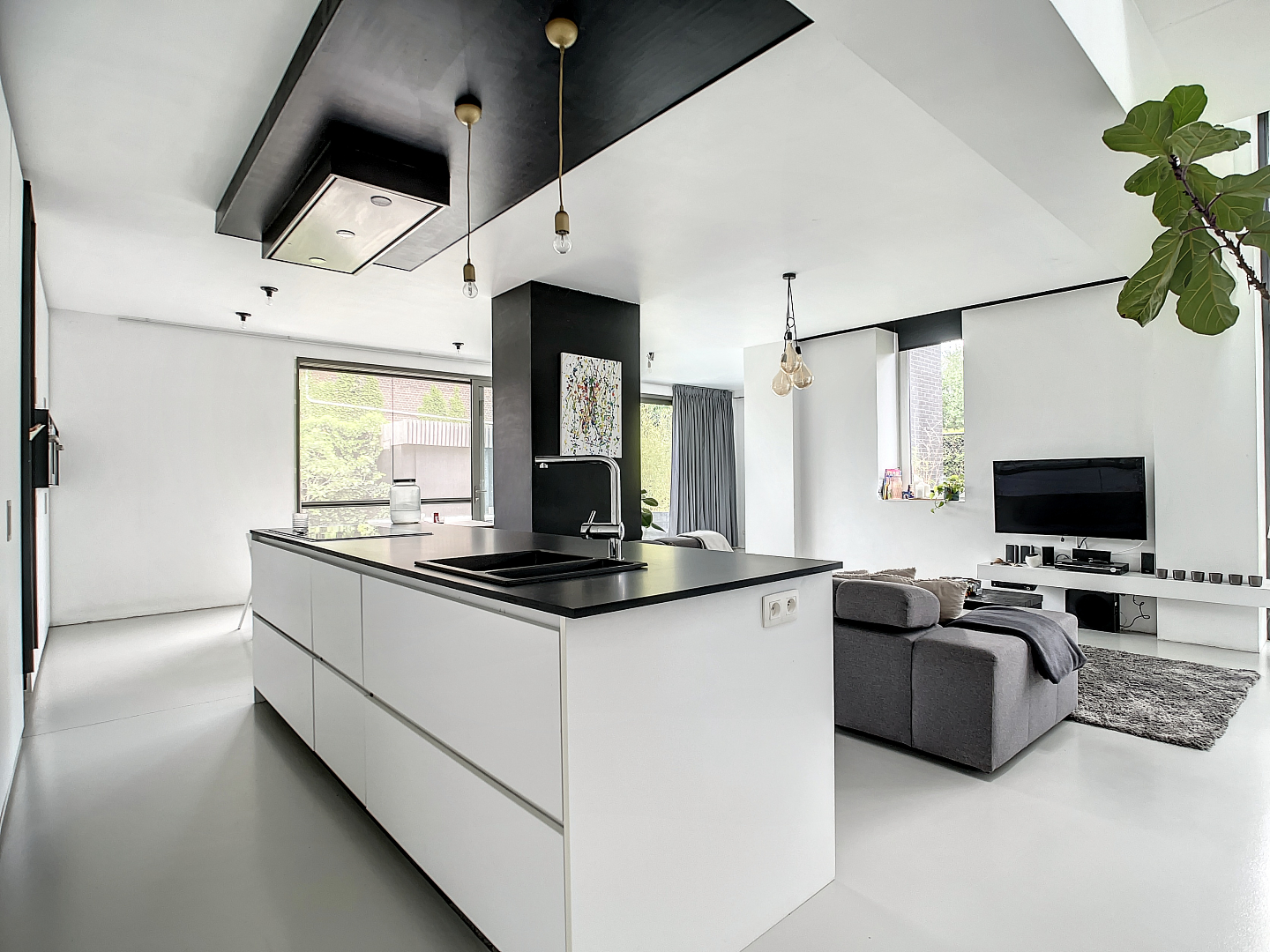 Op het gelijkvloers vind je aan de voorkant van de woning een commerciële ruimte, die voorheen diende als kapperszaak. Deze ruimte van 25,85m², met toilet en aansluiting water en afvoer, heeft zeer veel mogelijkheden. Het kan o.a. geïntegreerd worden in de gezinswoning of het kan dienen voor professionele doeleinden. Via de zijkant van de woning kom je in de ruime inkomhal die door de vide een echte eyecatcher is. Aansluitend heb je de lichtrijke leefruimte met open keuken. De keuken is volledige geïnstalleerd en omvat naast de vaatwasser ook een inbouw koffiemachine en stoomoven. Verder is er nog een handige berging waar de aansluiting voor de wasmachine en droogkast zich bevindt.