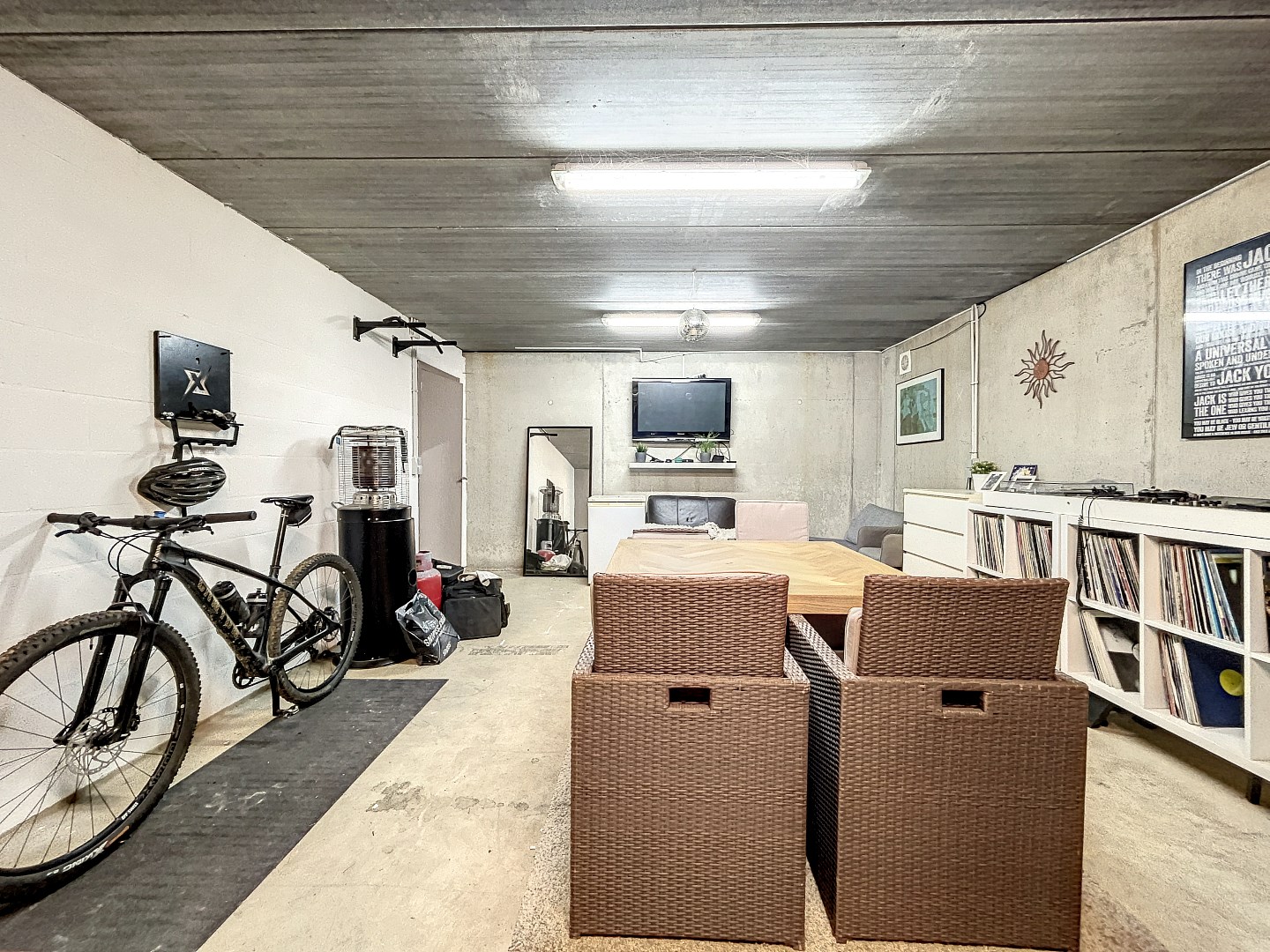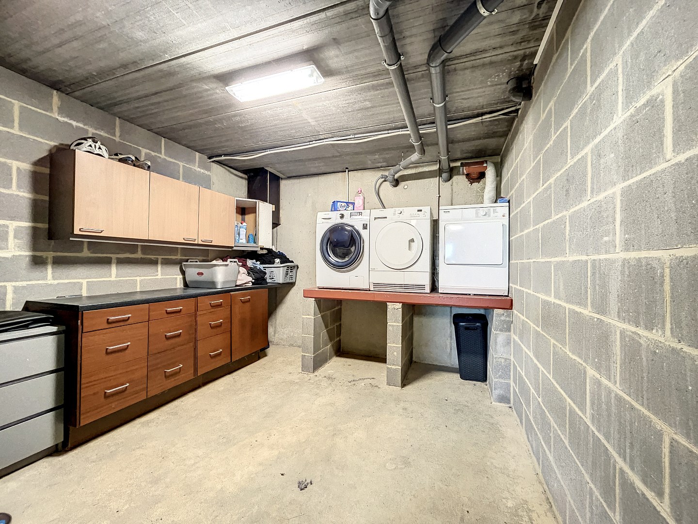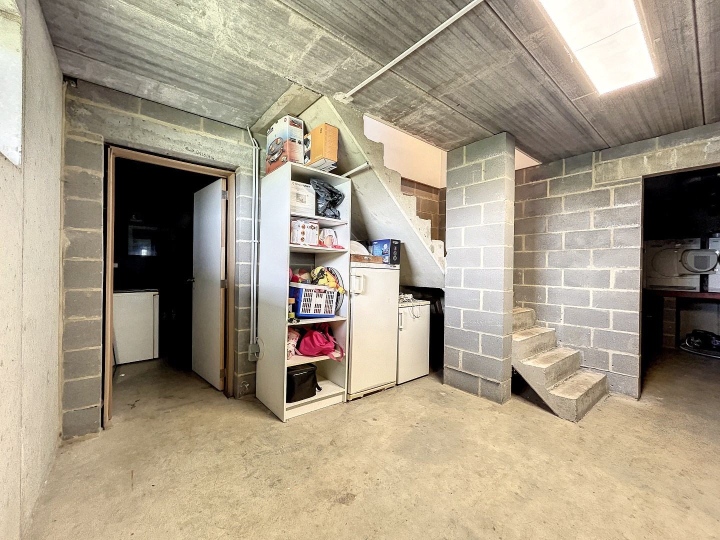 Opbergruimte is er voldoende door de kelder die onder de volledige woning loopt, zelfs de ruimte voor een “mancave” is aanwezig. Verder is er nog een inpandige garage en voorziet de oprit 6 a 8 parkeerplaatsen.