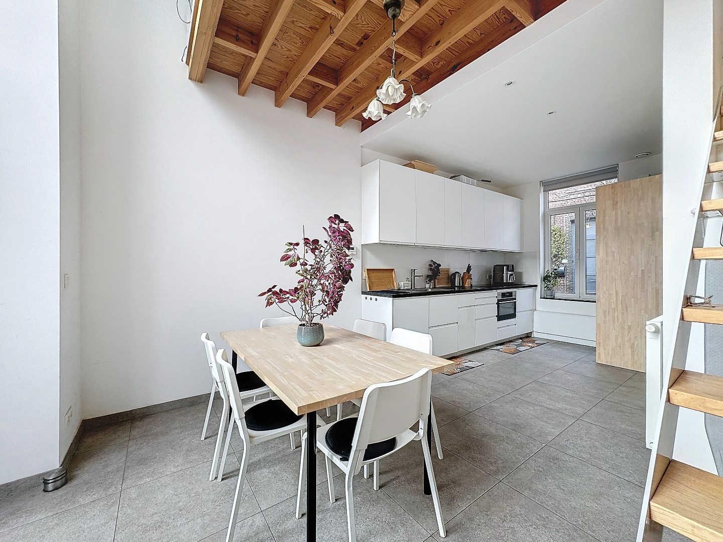 Je wordt begroet in een ruime en lichte keuken met eetkamer die perfect is voor gezellige avonden met vrienden en familie. De grote ramen zorgen voor een overvloed aan natuurlijk licht, wat de ruimte een warme en uitnodigende sfeer geeft. De aansluitende buitenruimte biedt een knus, sfeervol terras waar je kan genieten van de frisse lucht en een goed boek. Deze woning is een thuis, een plek om te ontspannen en tot rust te komen.