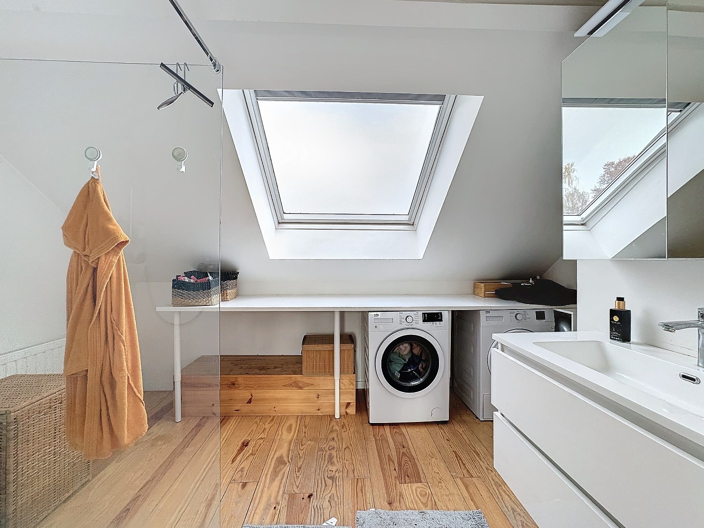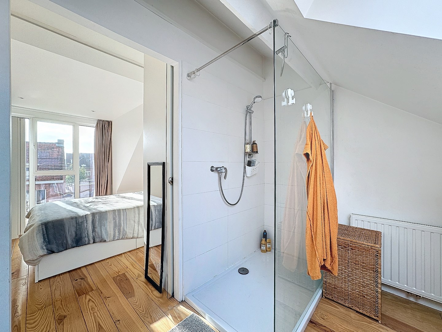 Op de eerste verdieping vind je een woonkamer en bureau, die naadloos in elkaar overvloeien. Op de tweede verdieping bevindt zich de slaapkamer met aansluitend de badkamer met inloopdouche, wasmachine en droogkast.
