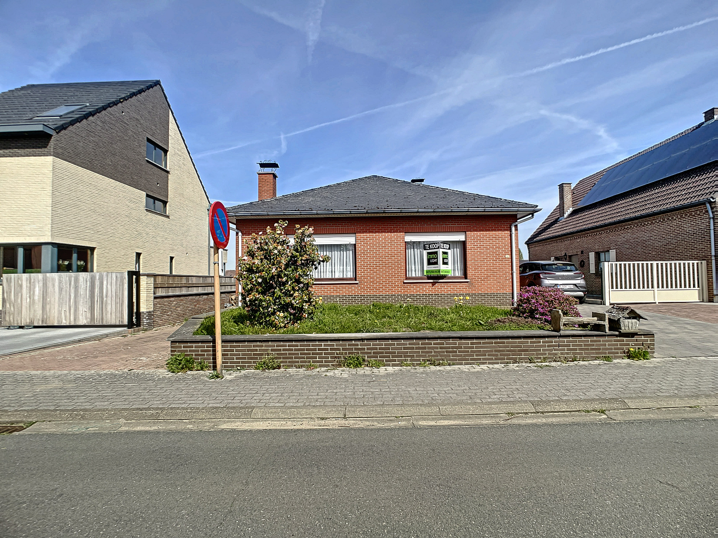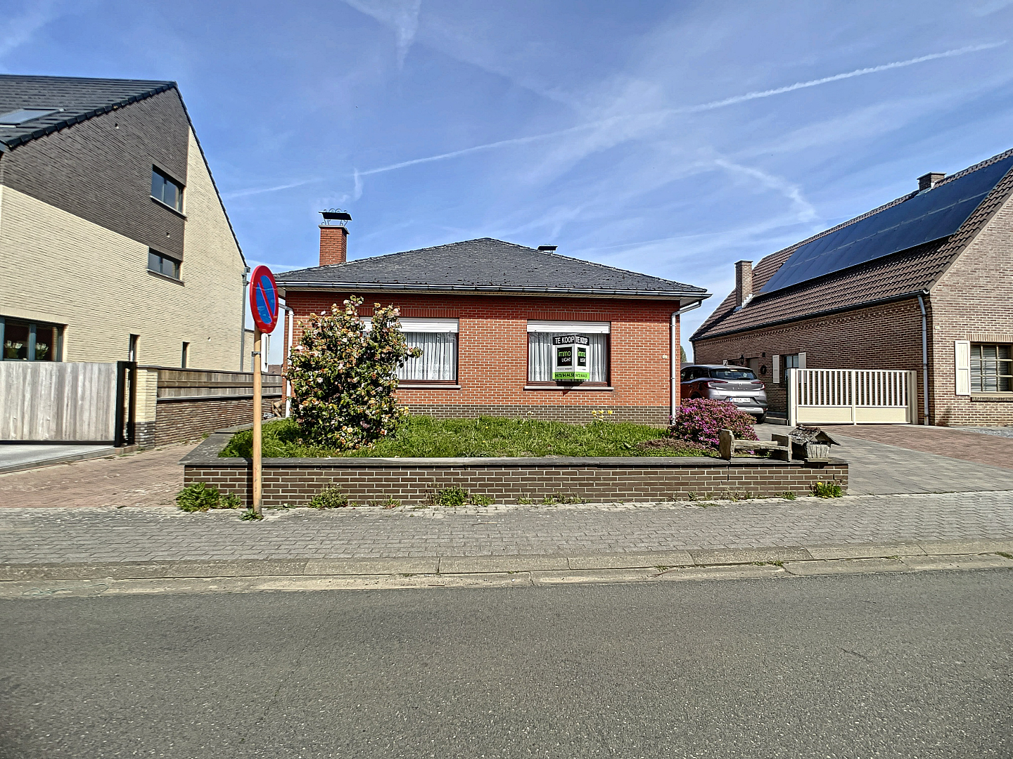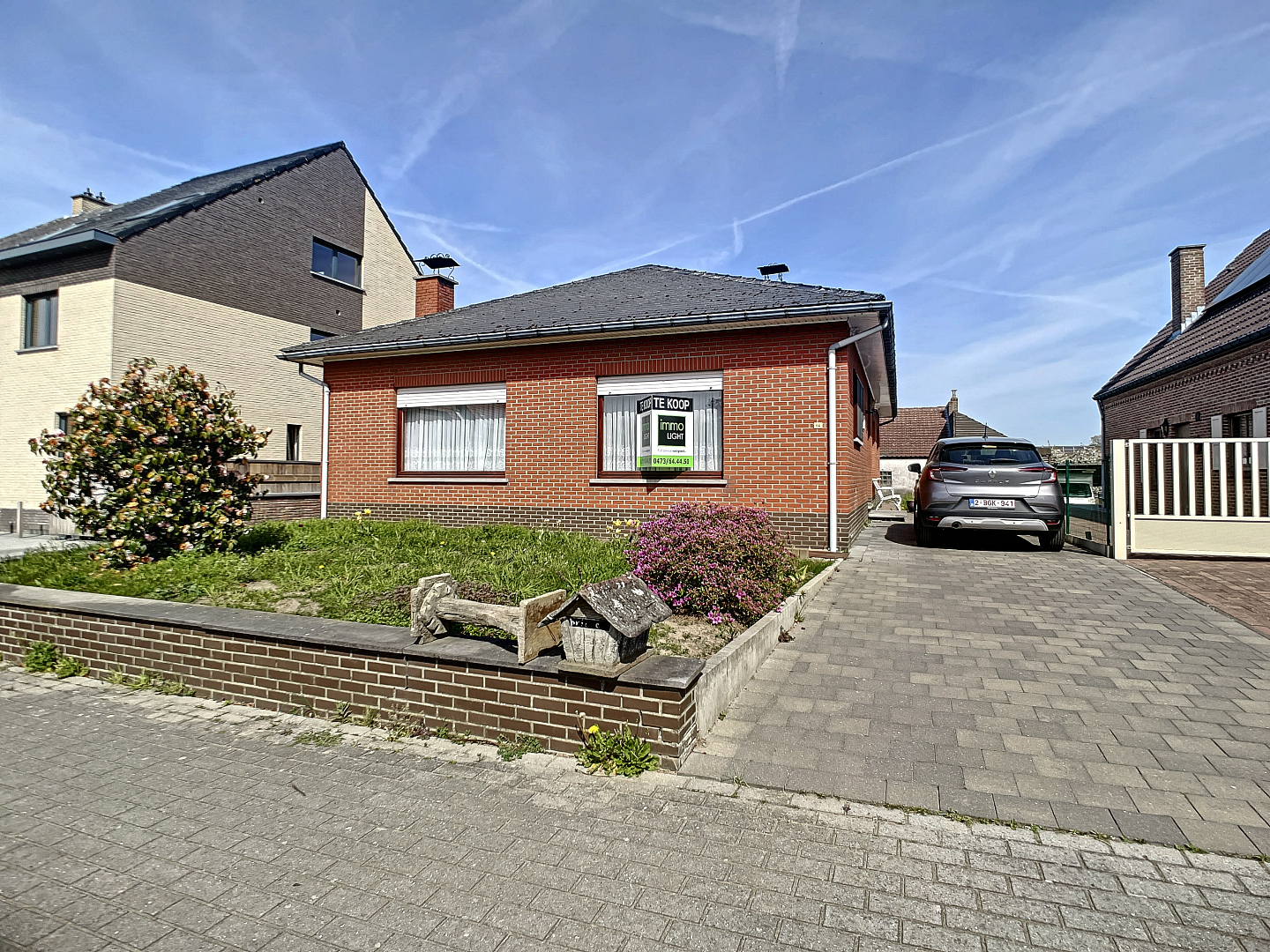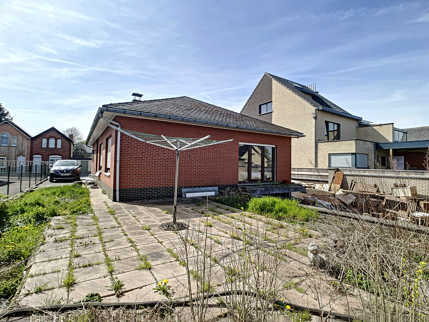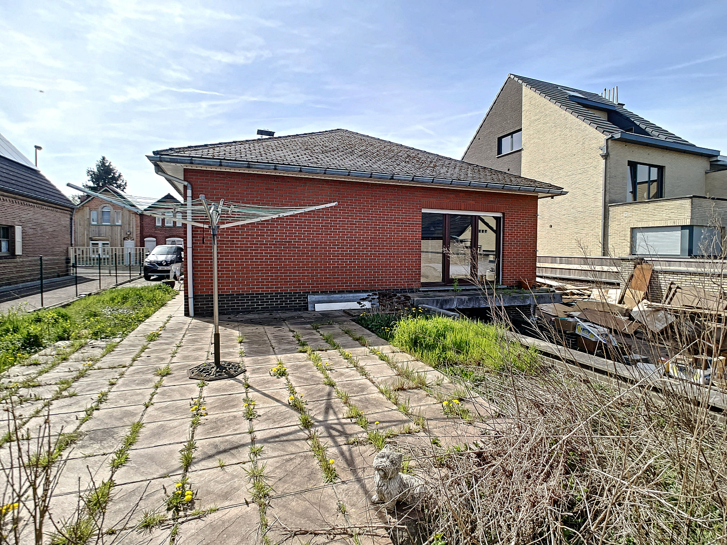 Aan beiden zijden van de woning is een inrit naar achteren voorzien alsook een garage in de kelderruimte.