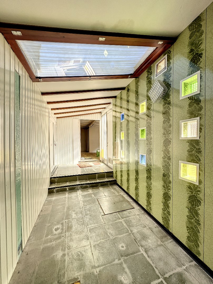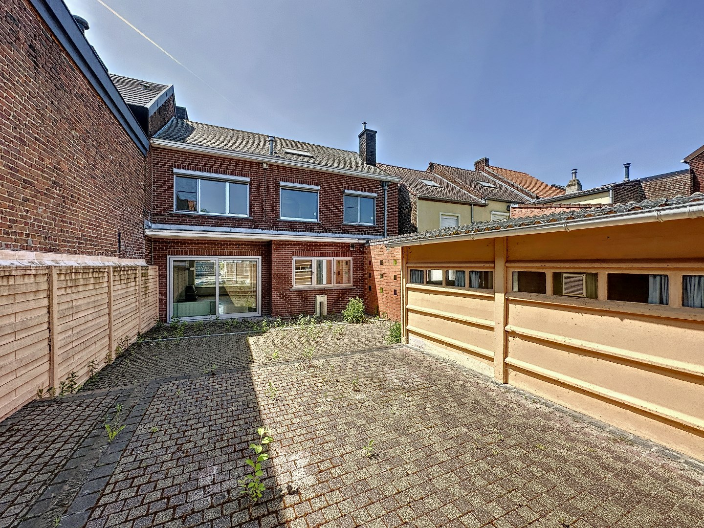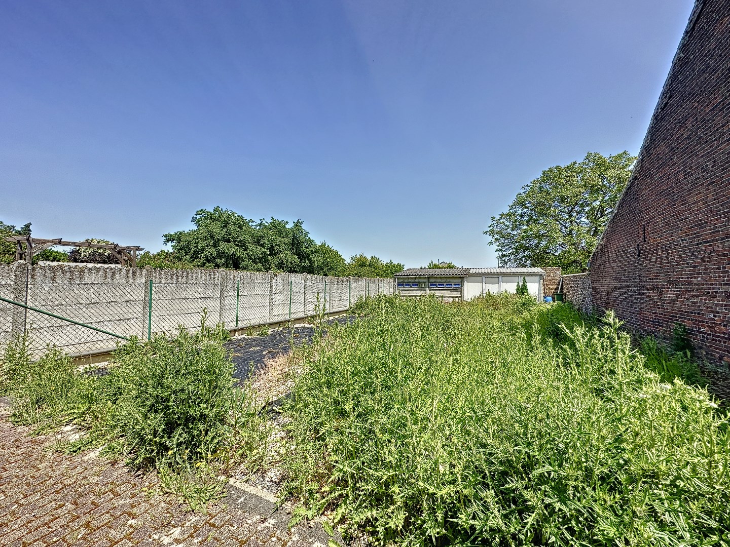 Het wegje links langs het huis heeft ook toegang tot de woning en de tuin.