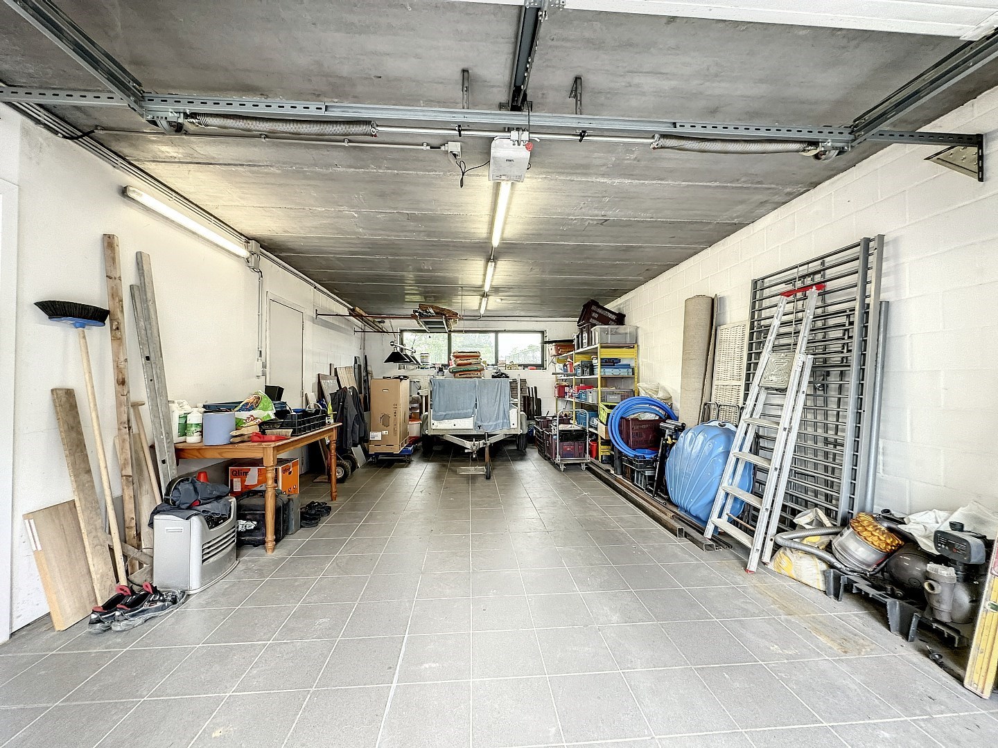 Op het gelijkvloers: een ruime inkomhal, een garage met plaats voor 2 wagens en een opbergruimte. Daarnaast is er ook nog plaats voor 3 wagens op de oprit.
